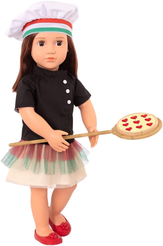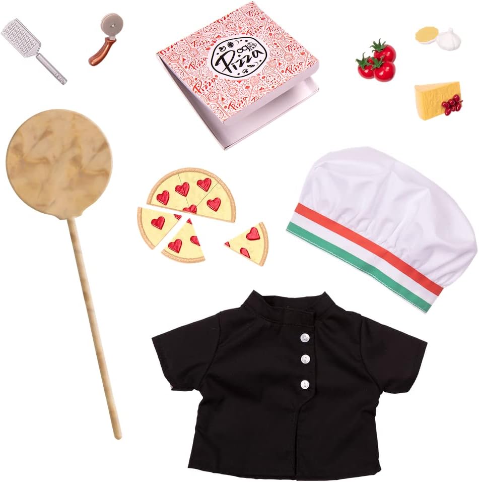 - Inclui: 1 boneca articulada, 1 bandolete, 1 blusa, 1 saia, 1 par de cuecas, 1 par de sapatos, 1 casaco de chef, 1 chapéu de chef, 6 fatias de pizza, 1 caixa de pizza, 1 molho de alho, 1 molho de tomate, 1 ralador de queijo, 1 bloco de queijo parmesão com uvas, 1 pá de pizza, 1 livro de capítulos, 1 marcador de páginas.
