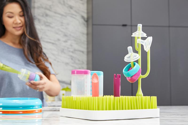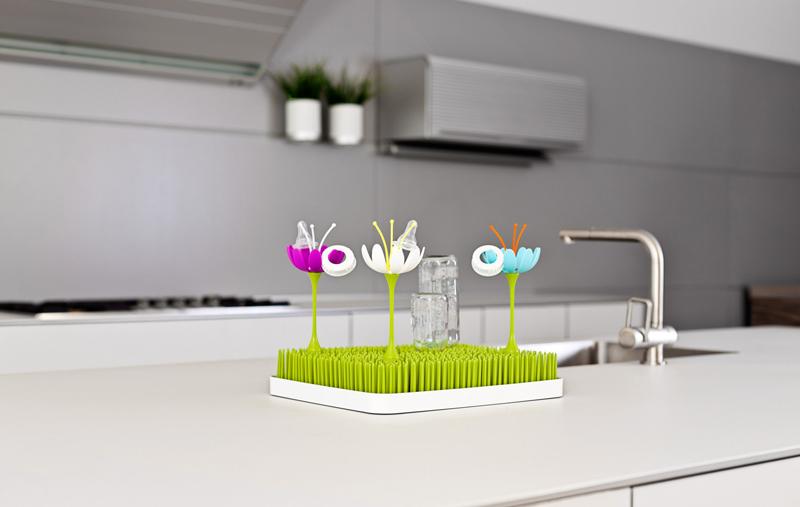 Boon introduz uma nova visão sobre as prateleiras de secagem. De mamadeiras a chupetas, a Grass mantém todos os acessórios do bebê secando ao ar nas lâminas flexíveis que se assemelham à grama real, enquanto a água se acumula na bandeja abaixo.