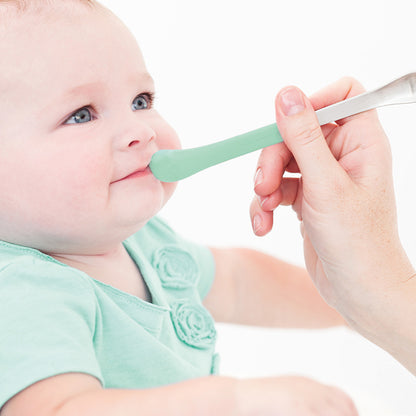 Ambos os lados têm uma ponta plana perfeita para limpar a comida que inevitavelmente acaba no rosto do bebê.