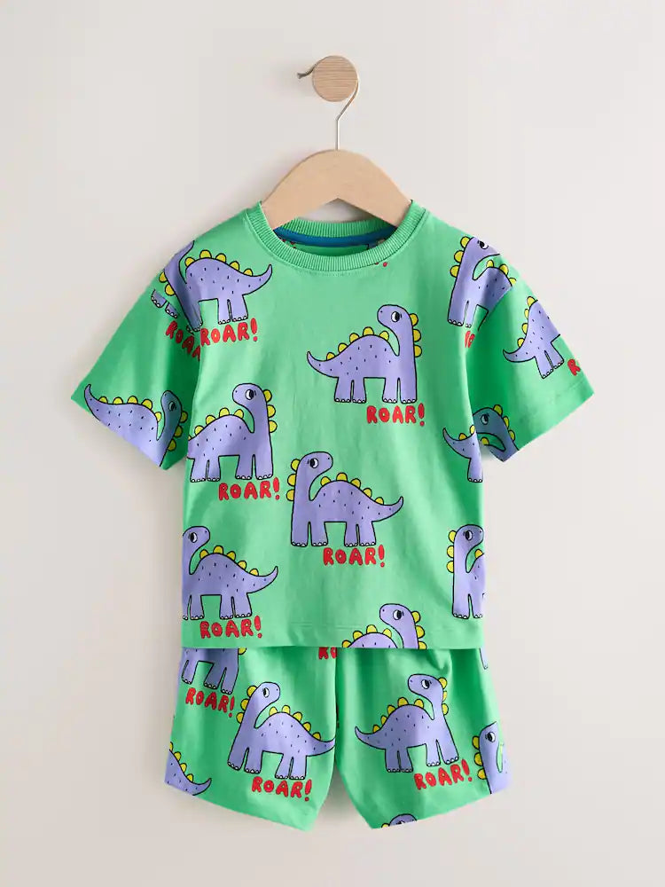 |Boy| Conjunto De 3 Pijamas Curtos Com Estampas Variadas De Dinossauro, Escavadeira e Lagosta nas cores azul, verde e vermelho (tamanhos de 9 meses a 8 anos)