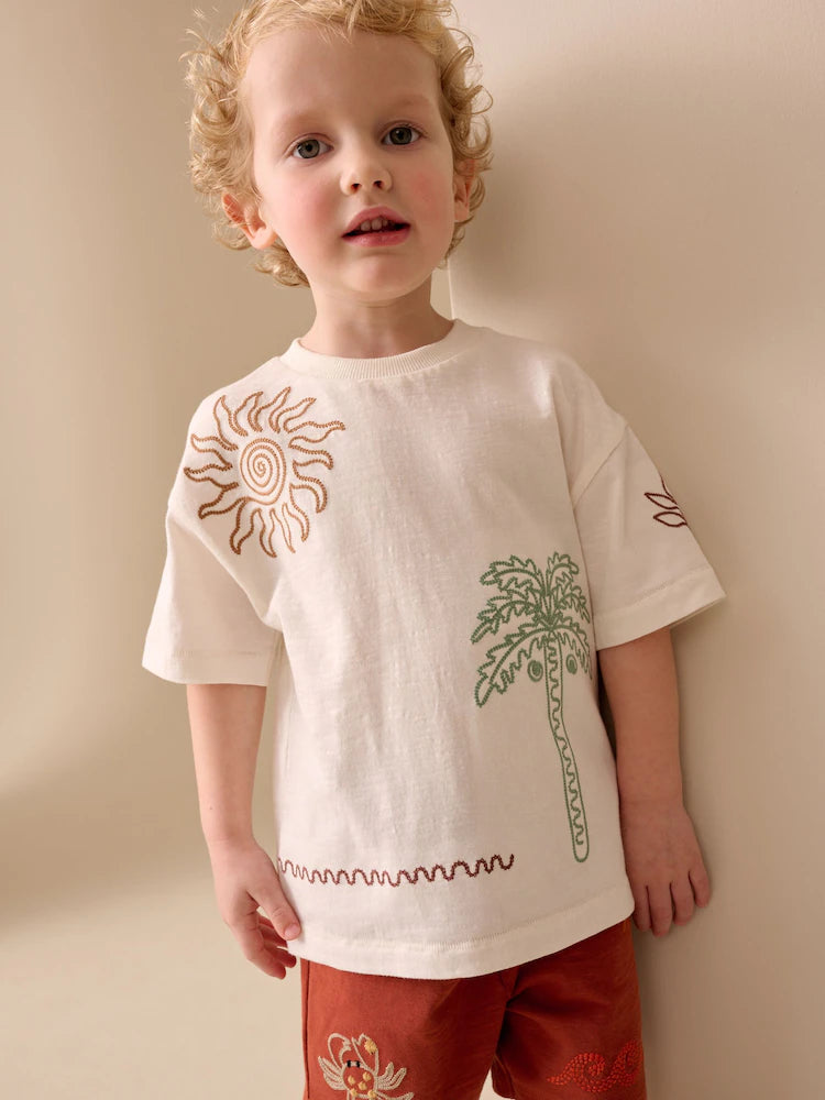 |Boy| Conjunto De Camiseta De Manga Curta e Shorts Bordados Com Palmeiras Na Cor Cru (3 meses a 7 anos)