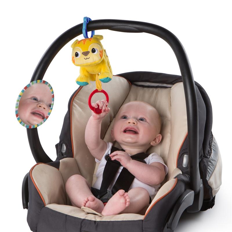 As características incluem um luxuoso brinquedo de leão que toca quatro melodias, um espelho para bebês e um chocalho de anel fácil de entender.