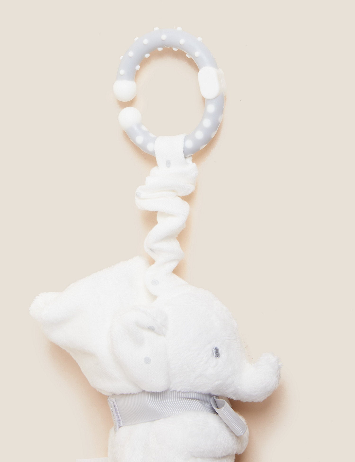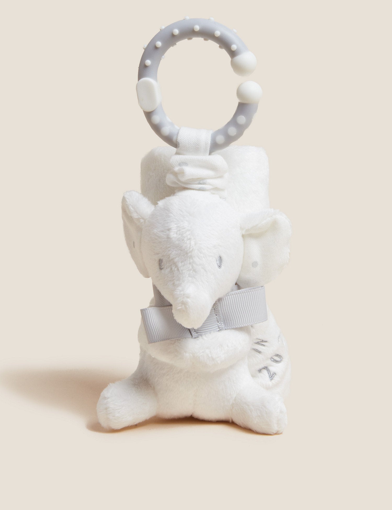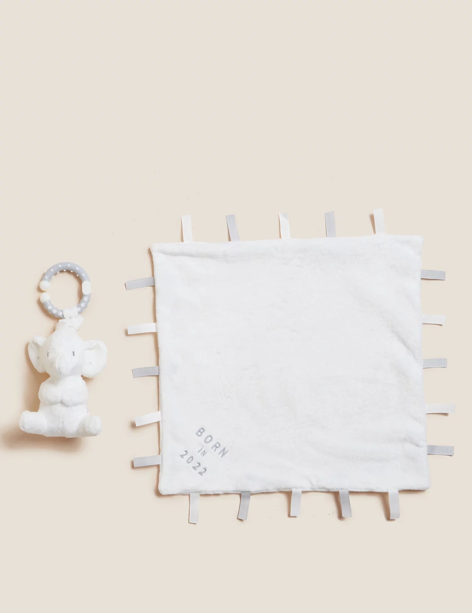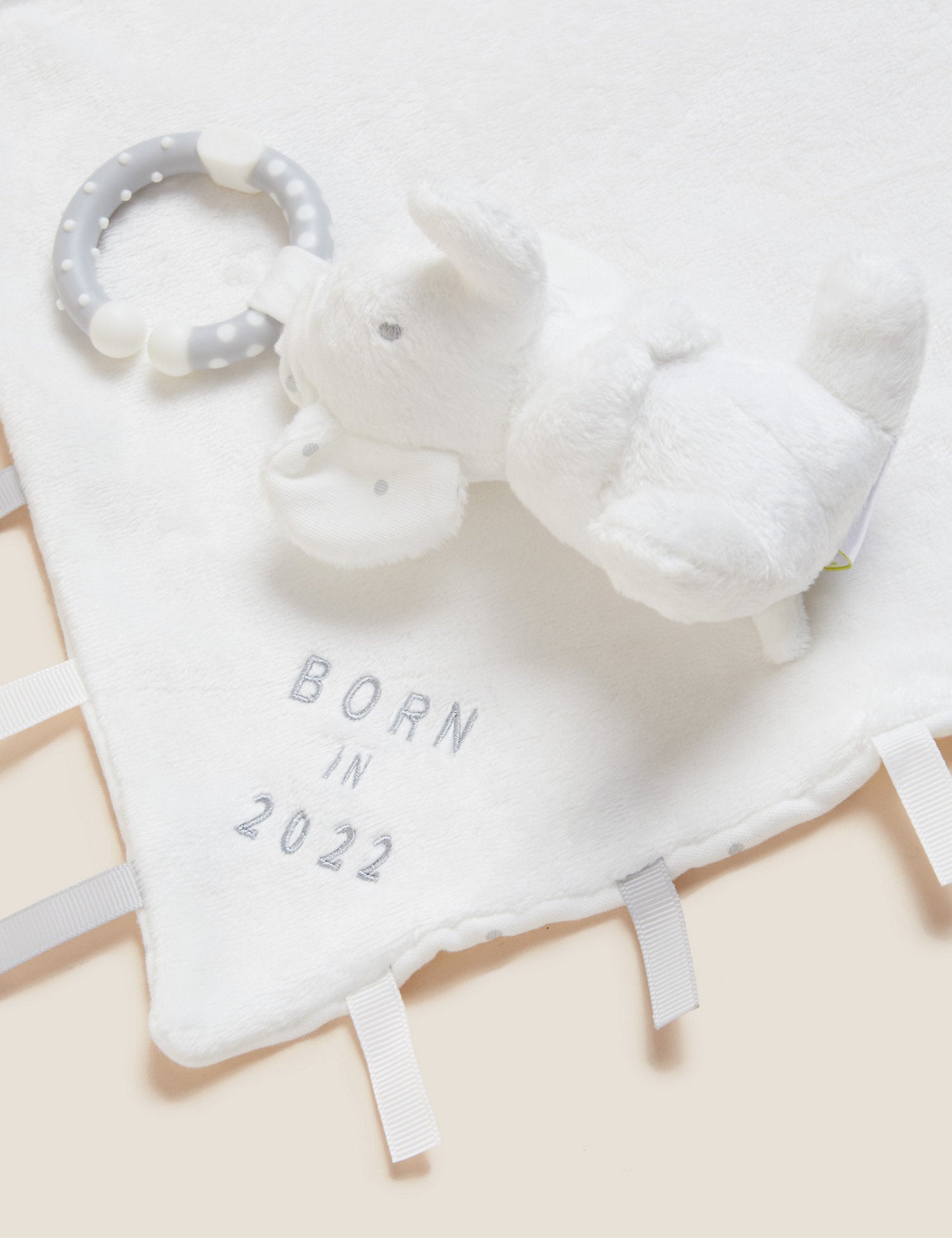Comemore uma nova chegada com esta lembrança de elefante fofinho e edredom. O edredom é projetado com detalhes de fita tátil e um slogan “Nascido em 2022” bordado em um canto. Um prático anel de dentição é anexado ao adorável brinquedo macio de elefante, que vem completo com um laço doce. Feito com forro de poliéster reciclado.