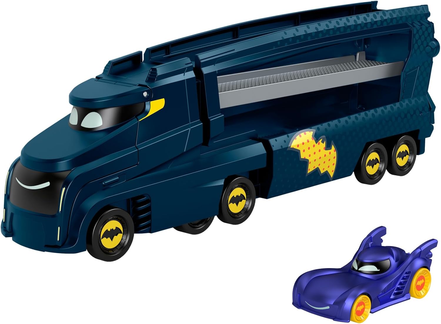 Caminhão de Brinquedos Fisher-Price DC Batwheels com Rampa e Batmóvel, Escala 1:55, Veículo de Brinquedo em Metal Fundido, para Crianças a partir de 3 Anos, HMX07