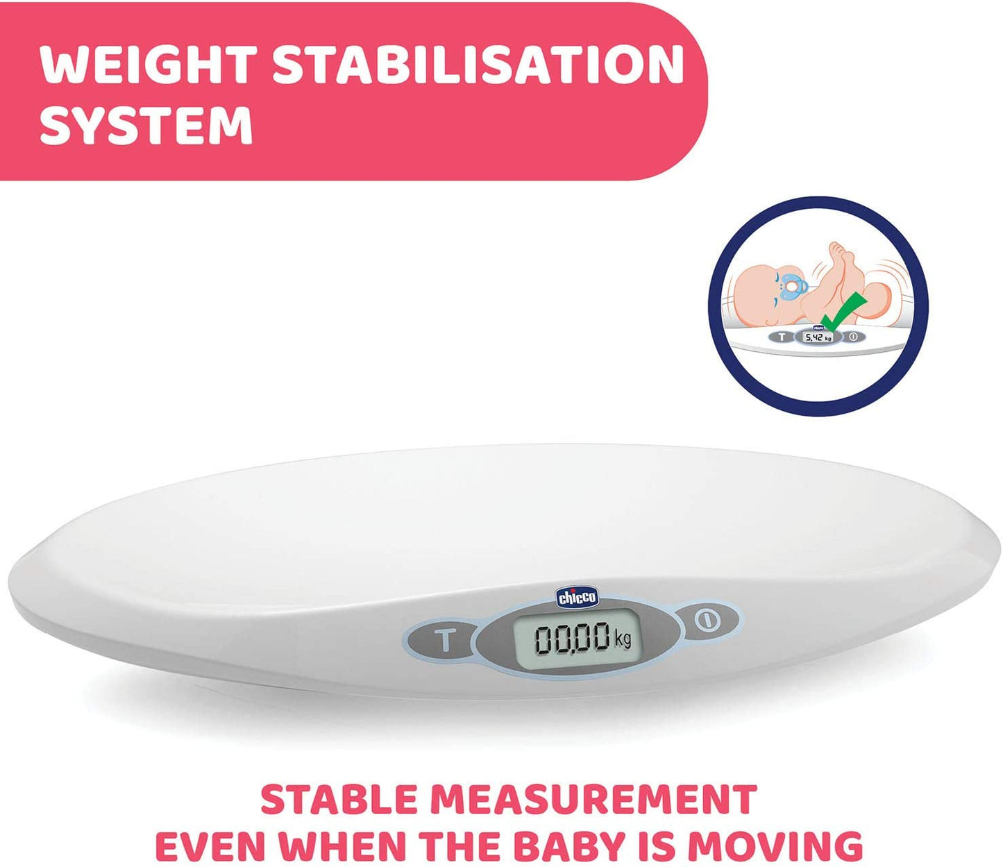 ESTABILIZADOR: A balança eletrônica do bebê está equipada com um sistema sofisticado que estabiliza o peso do bebê mesmo quando a criança se move