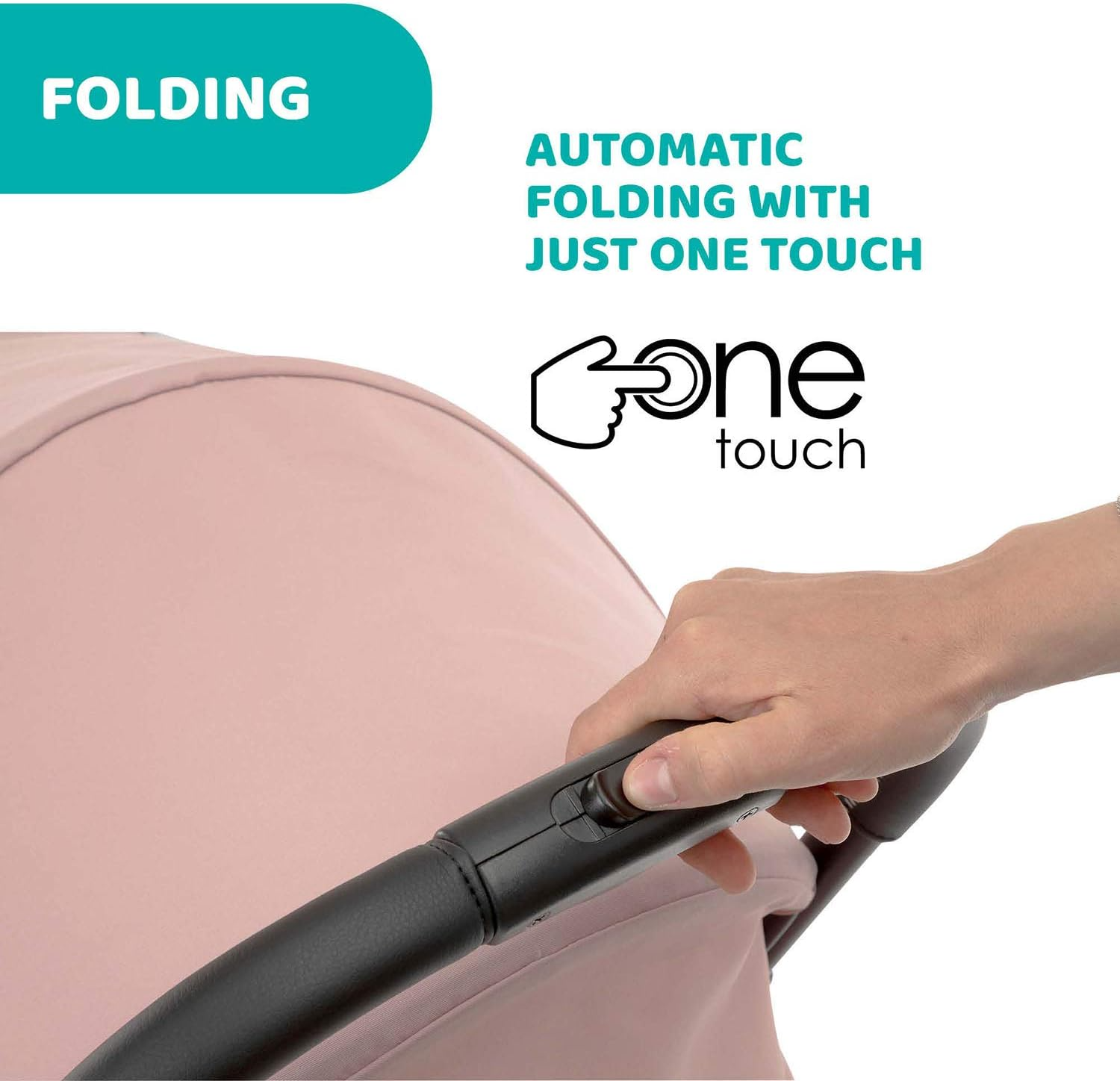 - Com apenas um toque, cheerio dobra-se automaticamente e dá-lhe a possibilidade de fechar o carrinho com apenas um simples movimento, mantendo o bebé nos braços sem problemas