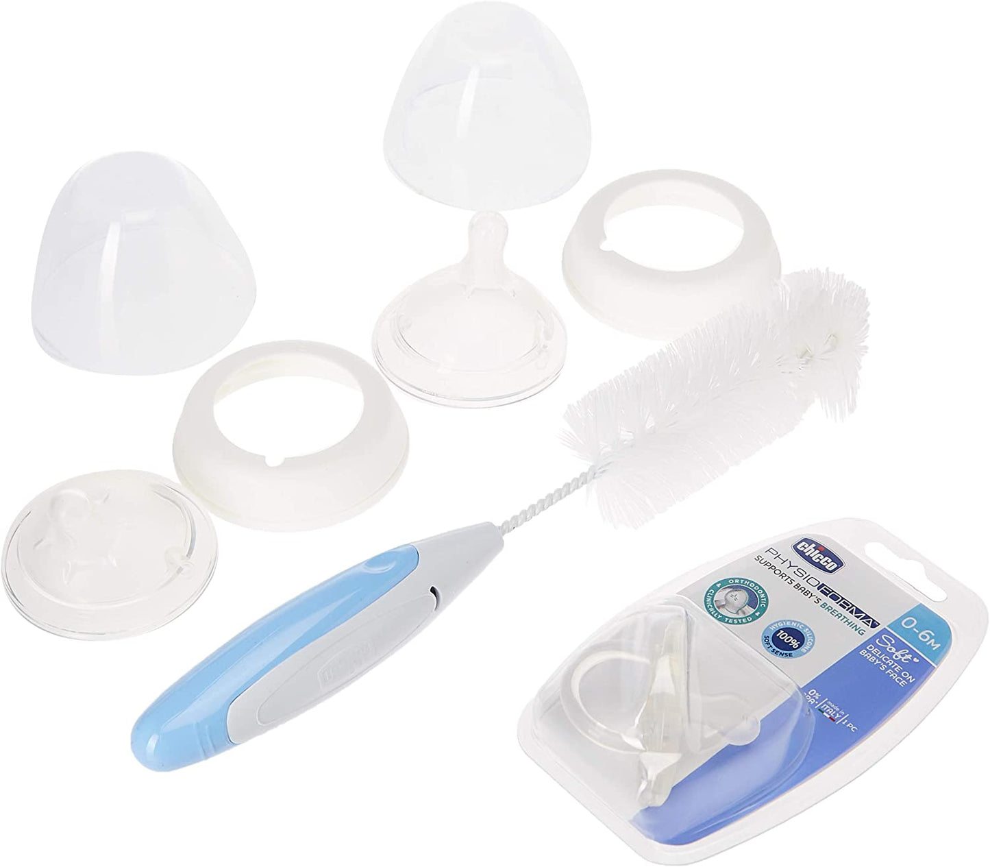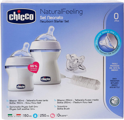 - Chicco conjunto de 4 inclui: 1 Mamadeira de 150ml, 1 Mamadeira de 250ml, 1 Chupeta e uma escovinha.