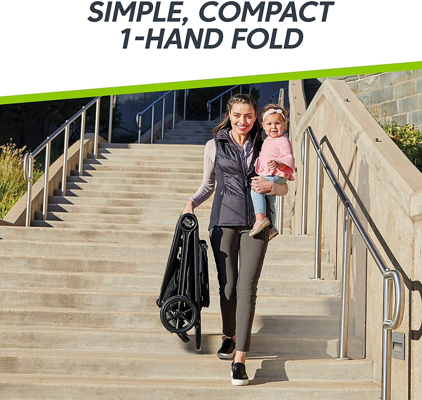 Dobra rápida e simples: Levante as correias do assento e o carrinho de passeio dobra-se de forma simples e compacta, formando uma dobra vertical; o bloqueio automático protege para transporte ou armazenamento