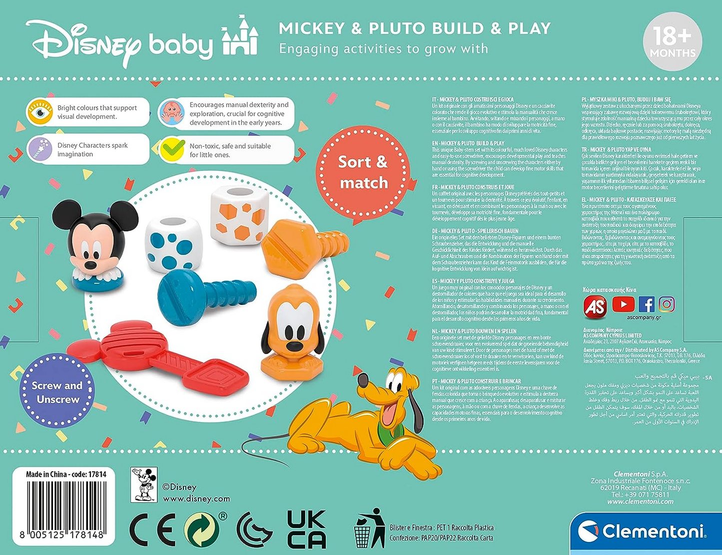 Clementoni 17814 Construa e jogue Disney Mickey Development & Activity, Empilhamento educacional, Infantil, Aprendizagem sensorial, Criança de 18 meses, Brinquedos para primeiros anos, Fabricado na Itália, Multilíngue
