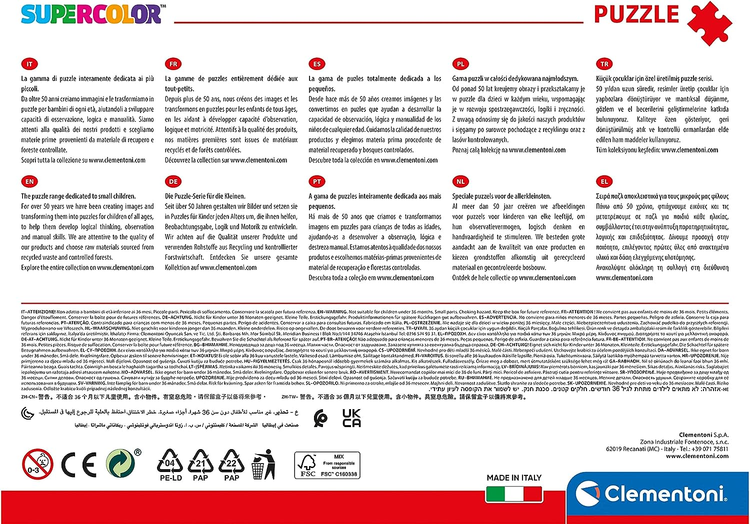 - Aguçadamente atenta à importância da consciência ambiental, a Clementoni faz uso extensivo de materiais reciclados e evita componentes que contenham poluentes. Feito na Itália.
