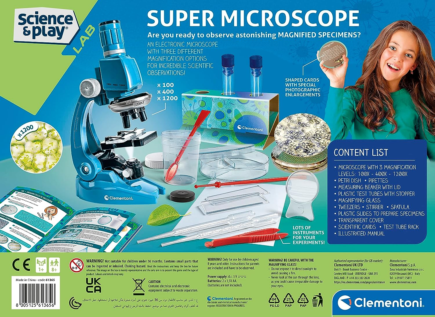 Clementoni 61365 Science & Play Lab-Super brinquedos educativos e científicos, microscópio para crianças de 8 a 12 anos, 1200X, kit de experimentos, versão em inglês fabricado na Itália, multicolorido