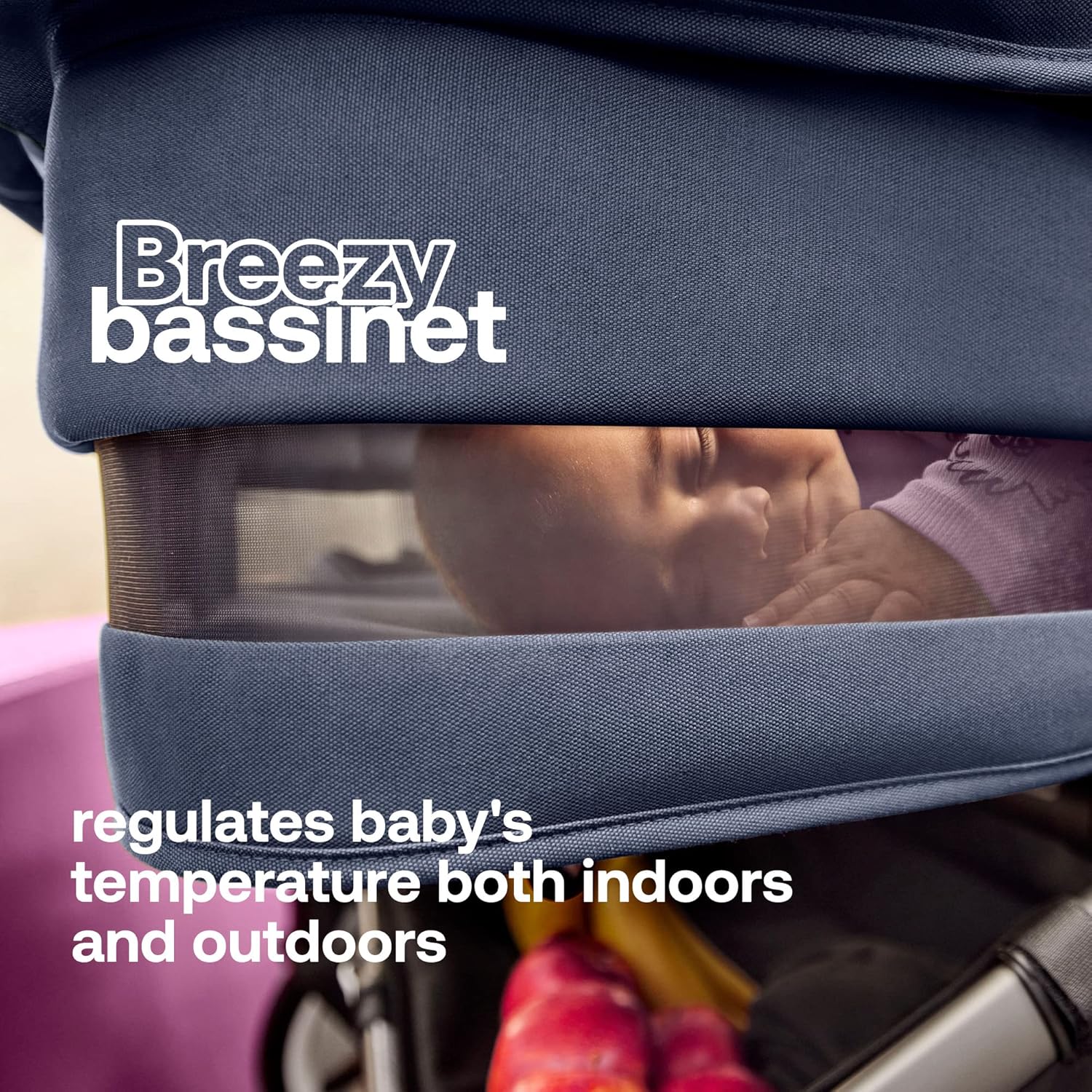 - O berço aprimorado com novo painel de ventilação oferece proteção superior contra as intempéries, enquanto as grandes rodas à prova de furos garantem passeios suaves em todos os terrenos