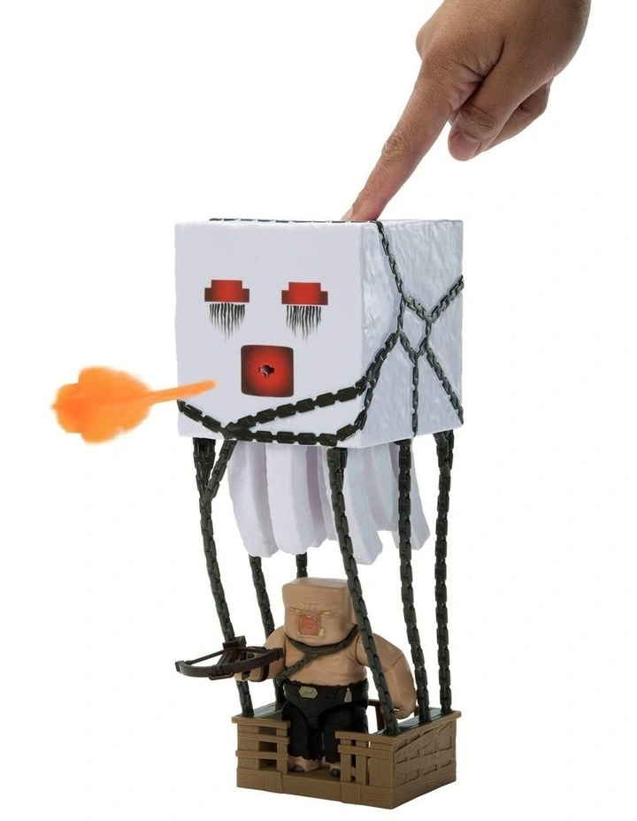O Blast Attack Ghast mostra um momento emocionante do filme em que os ghasts são acorrentados e usados como veículos de ataque pelo exército de porquinhos malvados. Pressiona a parte superior da figura fantasmagórica para ouvir sons de assobios e batalhas, ativar luzes e lançar o projétil. Note que as cores e as decorações podem variar.