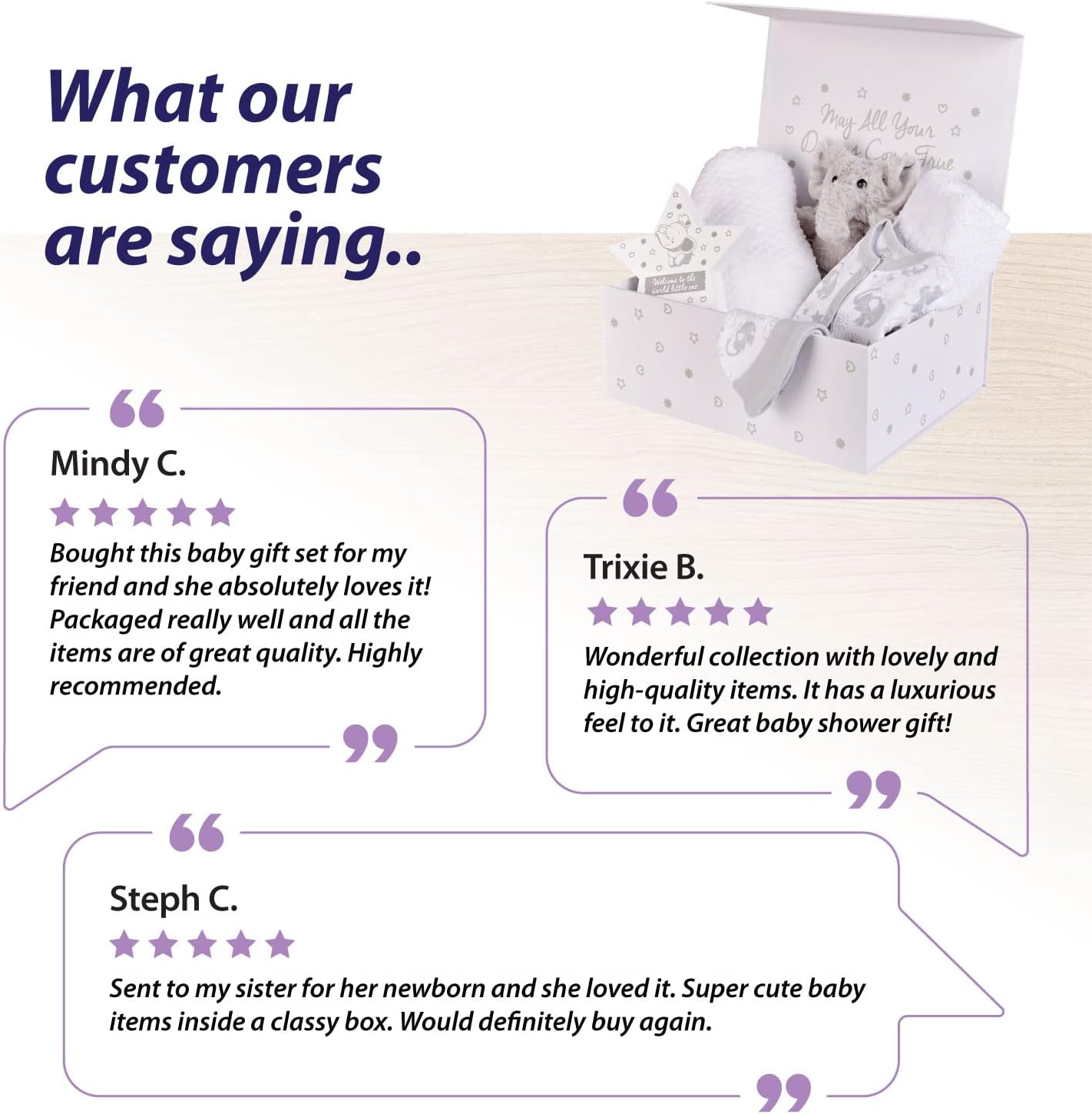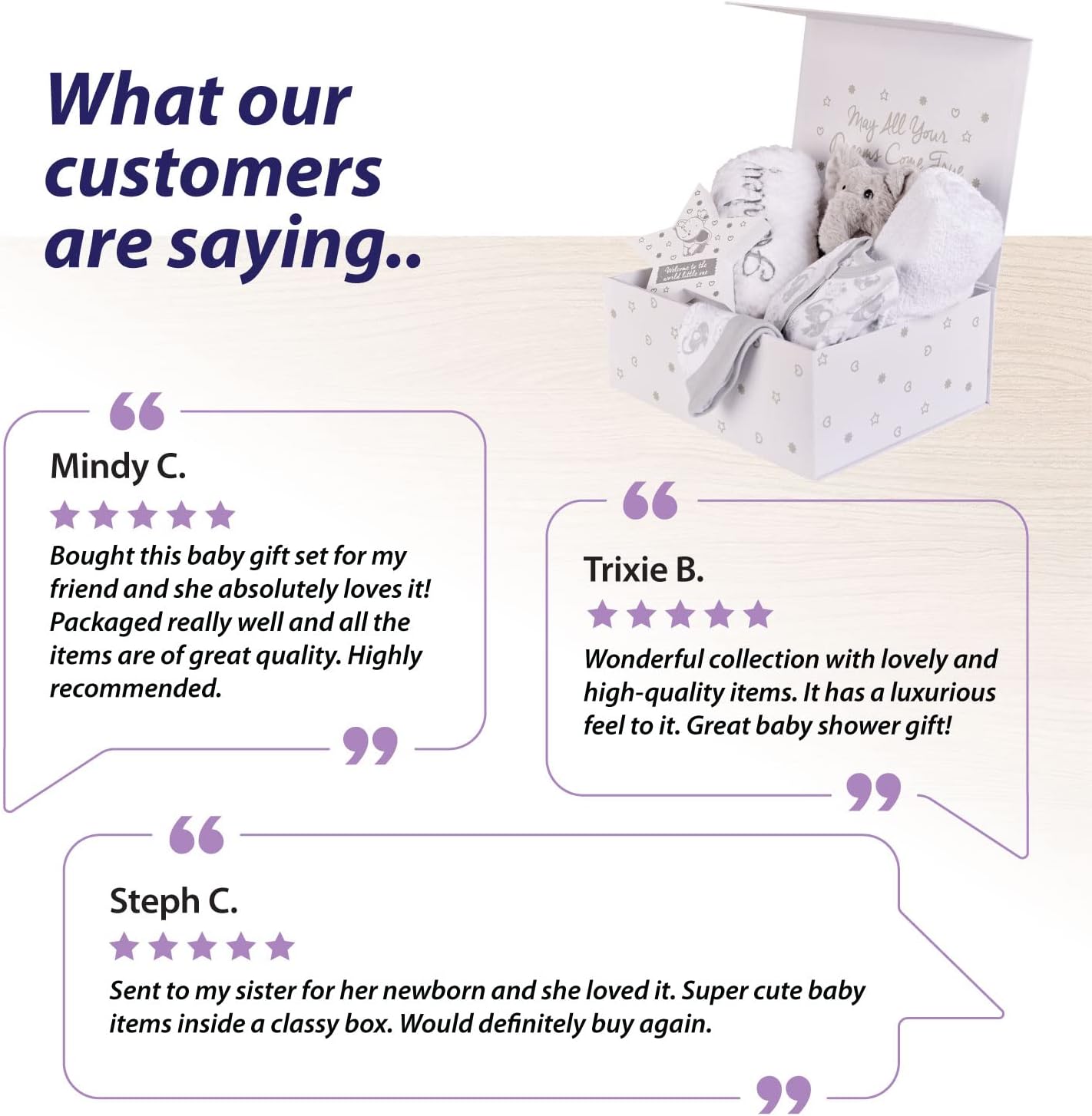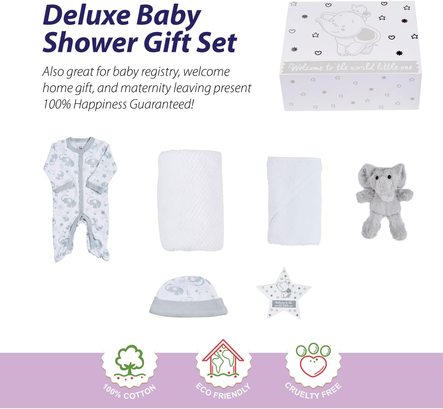 - BABY HAMPER: You will not be disappointed at the quality of baby clothes. Includes a white waffle wrap blanket, hooded towel, sleep suit and premature baby hat. A grey elephant soft toy and a star plaque ornament for the baby's room complete this compact gift set.