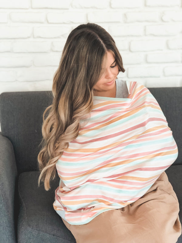 Este item pode ser usado como uma capa de amamentação, capa de assento de carro, capa de assento de carrinho, capa de assento de cadeira alta ou cachecol infinito.