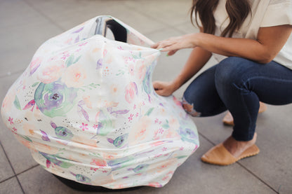 Este item pode ser usado como uma capa de amamentação, capa de assento de carro, capa de assento de carrinho, capa de assento de cadeira alta ou cachecol infinito.