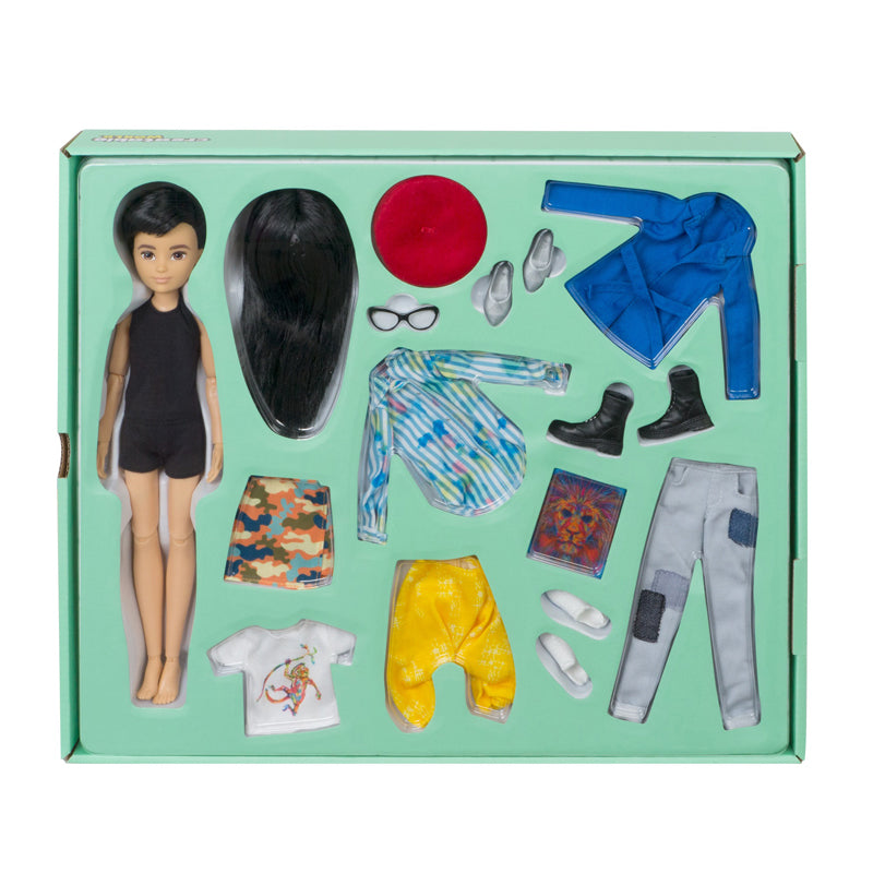 A boneca de 11 polegadas (29,94 cm) usa um tanque e shorts, tem um corte de cabelo curto e vem com seis peças de roupa, três pares de sapatos, dois acessórios adicionais e uma peruca de cabelos compridos - peças versáteis que dão às crianças liberdade de fazer seus personagens quem eles querem que eles sejam. Vista a boneca de uma maneira para um personagem e troque-a por alguém completamente diferente! As roupas saem direto do parquinho e os detalhes autênticos a mantêm ainda mais real. A peruca é fácil de colocar e tirar - as crianças podem trocar cabelos compridos por cabelos curtos e depois voltar a usá-los. Adicione uma saia, calça ou use as duas. Acessórios ... ou não.