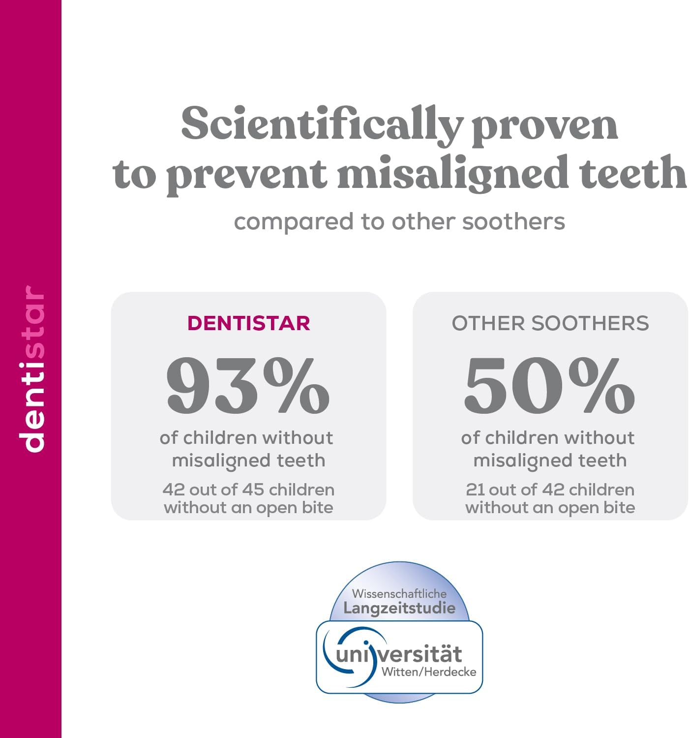 - Amigável aos dentes e à mandíbula - Graças ao inovador degrau dentário Dentistar, a chupeta reduz a pressão na mandíbula e nos dentes em 90%*** e está comprovado que previne o desalinhamento dos dentes*.
