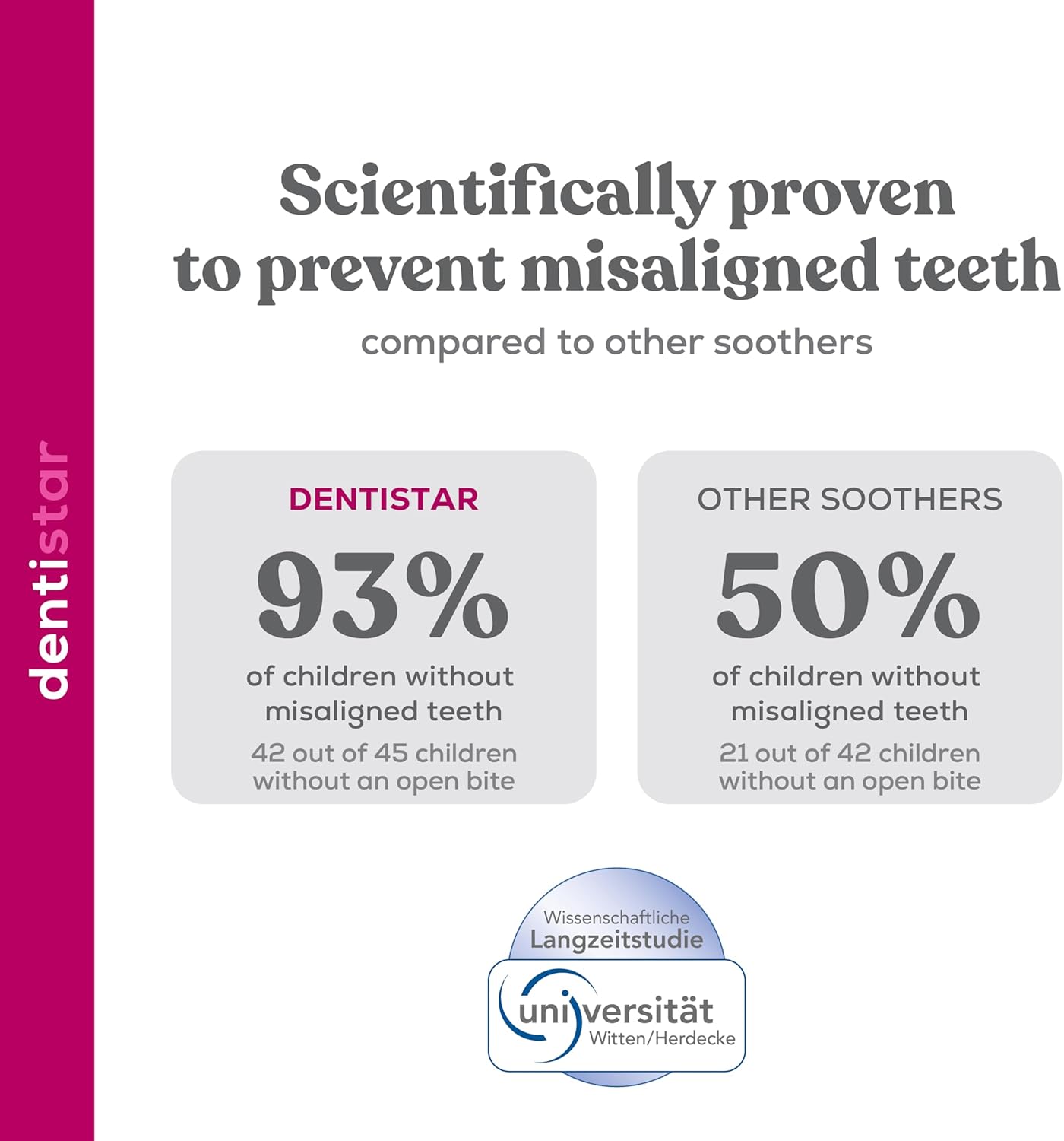 - Amigável aos dentes e à mandíbula - Graças ao inovador degrau dentário Dentistar, a chupeta de silicone reduz a pressão na mandíbula e nos dentes em 90%*** e foi comprovado que previne dentes desalinhados*.