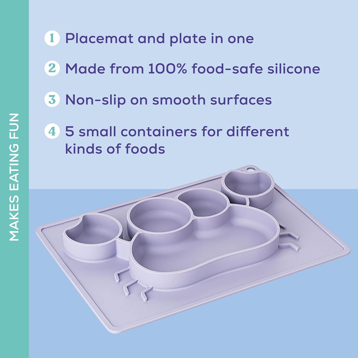- Antiderrapante - Como uma bandeja antiderrapante e um prato para bebês, este tapete de jantar pode aderir facilmente a superfícies lisas, como mesas de jantar, e evita escorregões e derramamentos.