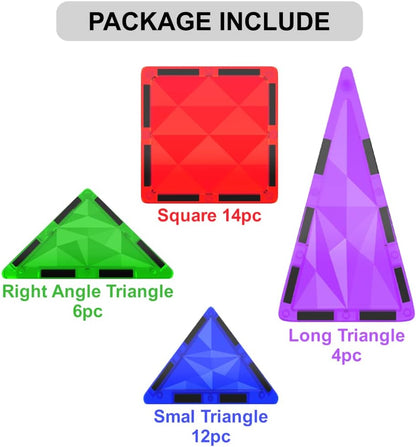 - O pacote inclui - Quadrado 14 peças, Triângulo retângulo 6 peças, Triângulo longo 4 peças, Triângulo pequeno 12, Manual - 1 peça, Caixa de varejo - 1 peça.