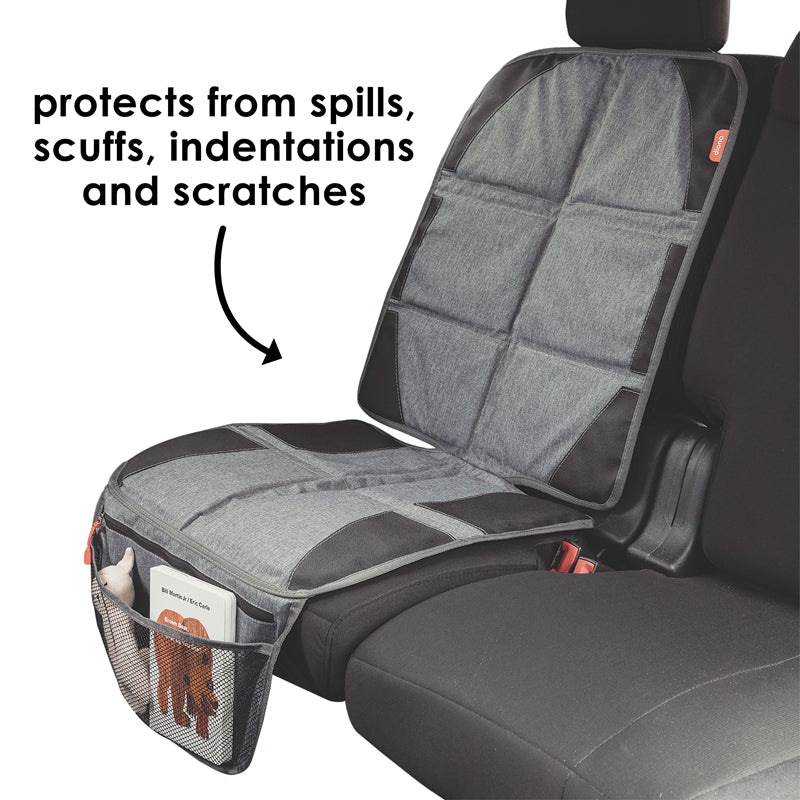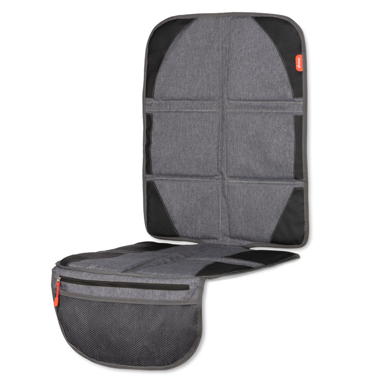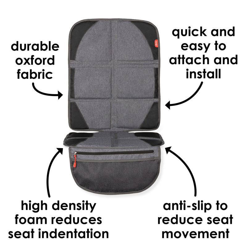 É adequado para uso com assentos infantis de carro, conversíveis e boosters, possui um material antiderrapante para reduzir o movimento do assento e seus painéis de espuma de alta densidade protegem contra arranhões, reentrâncias e arranhões e, sendo à prova d'água, também protege contra derramamentos. Ele também tem um grande bolso de malha, que mantém as coisas seguras e visíveis.