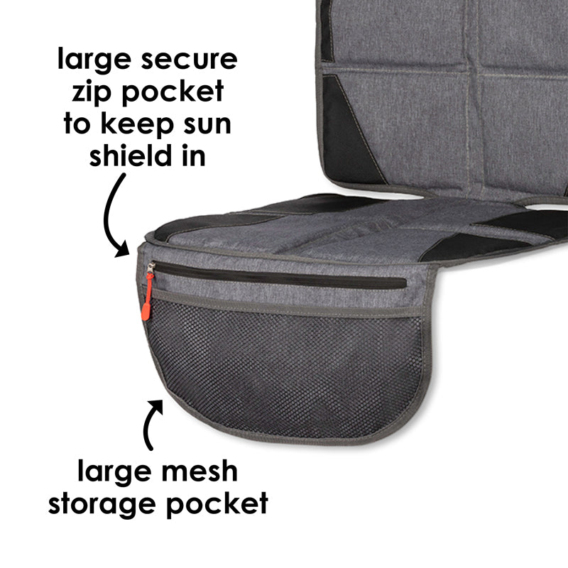 O Ultra-Mat Deluxe inclui todos os excelentes recursos do Ultra Mat® da Diono, mas com um escudo térmico adicional para proteger o assento do carro da luz solar, protegendo o carro e o bebê.