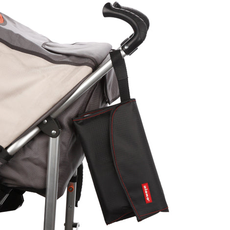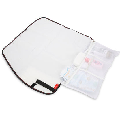 O design compacto se desdobra em um trocador acolchoado com bolsos de armazenamento úteis. Bolsos de malha com zíper para objetos de valor, uma alça para prendê-lo ao carrinho e um estojo de plástico para lenços umedecidos. Impermeável e lavável. Uma solução prática para mudar o bebê em movimento!