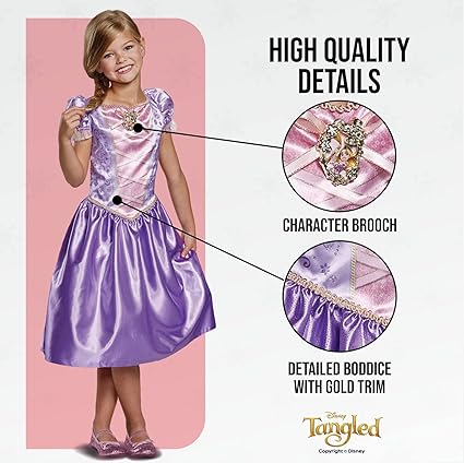 - CARACTERÍSTICAS MÁGICAS: Este traje clássico da Rapunzel apresenta padrões detalhados de renda no corpete, mangas bufantes, detalhes dourados no decote e na cintura e um camafeu de personagem.