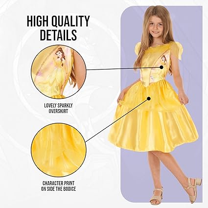 - PROJETADO COM O CONFORTO EM MENTE: Apresenta material macio de alta qualidade no vestido com saia peplum de várias camadas. As icônicas mangas drapeadas da Belle são características, bem como estampas de personagens na lateral do corpete.