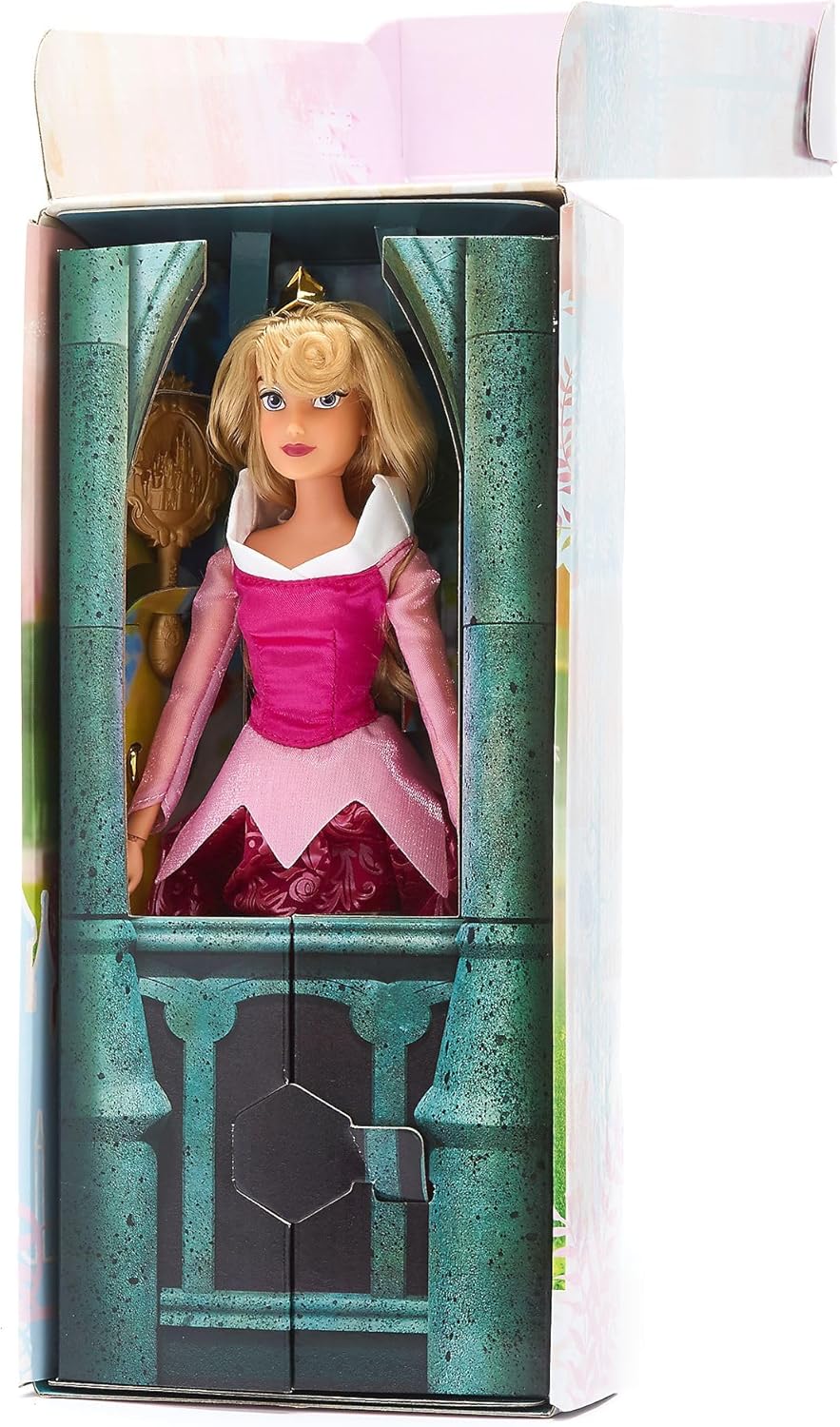 - Como parte da linha de bonecas clássicas da Disney Store, a Princesa Aurora é apresentada em uma caixa de janela ilustrada, com embalagem sem plástico feita de papel de origem sustentável e 100% reciclável.