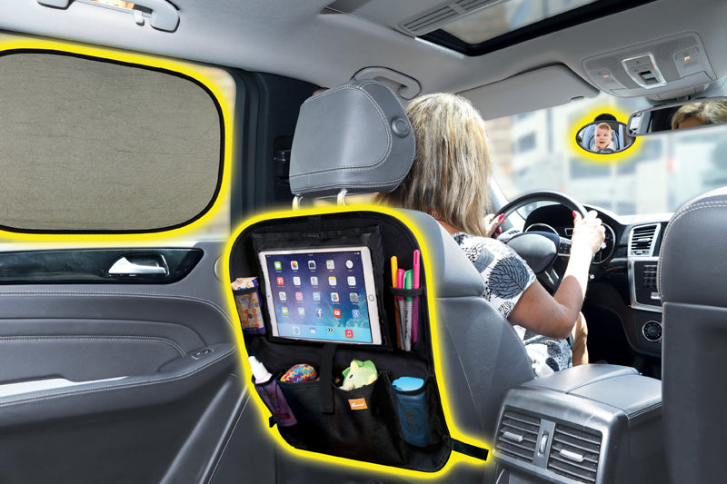 Inclui um sinal de 'Bebê a bordo', espelho de assento traseiro ajustável de luxo, espelho de pára-brisa dianteiro Ezy-View e 2 unidades de persianas de carro Insta-Cling.