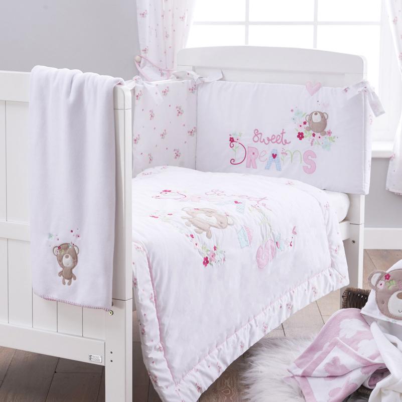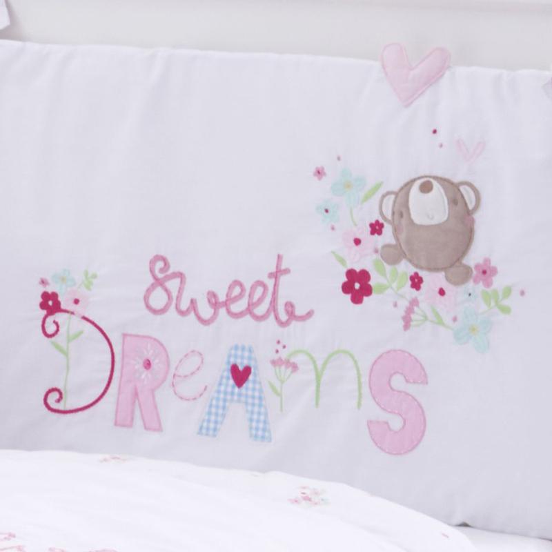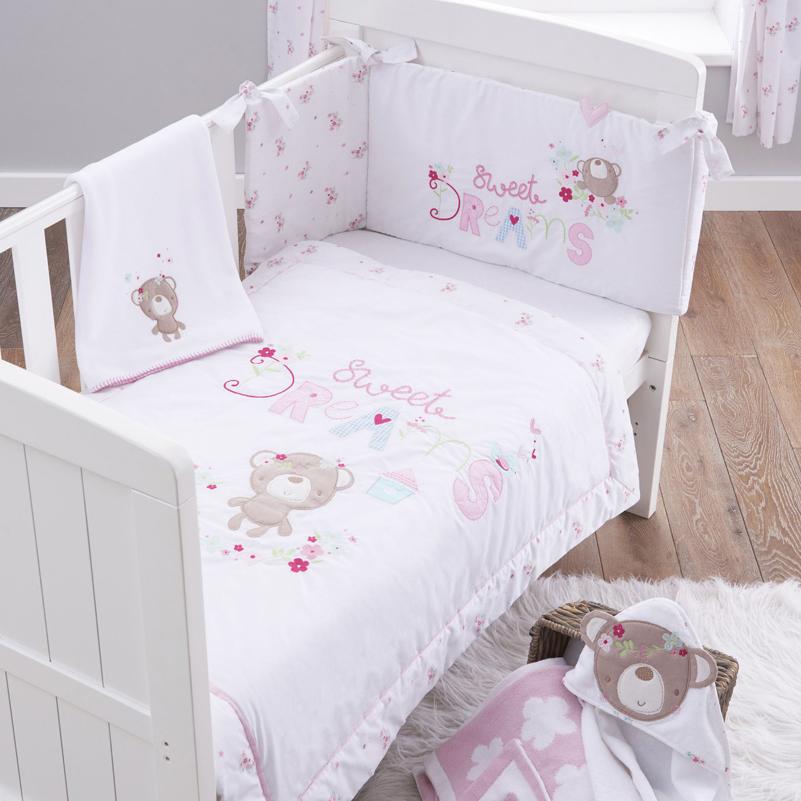 Essa linha certamente dará ao seu pequenino Sweet Dreams, com tecidos estampados florais macios, apliques e um lindo urso entre as flores.