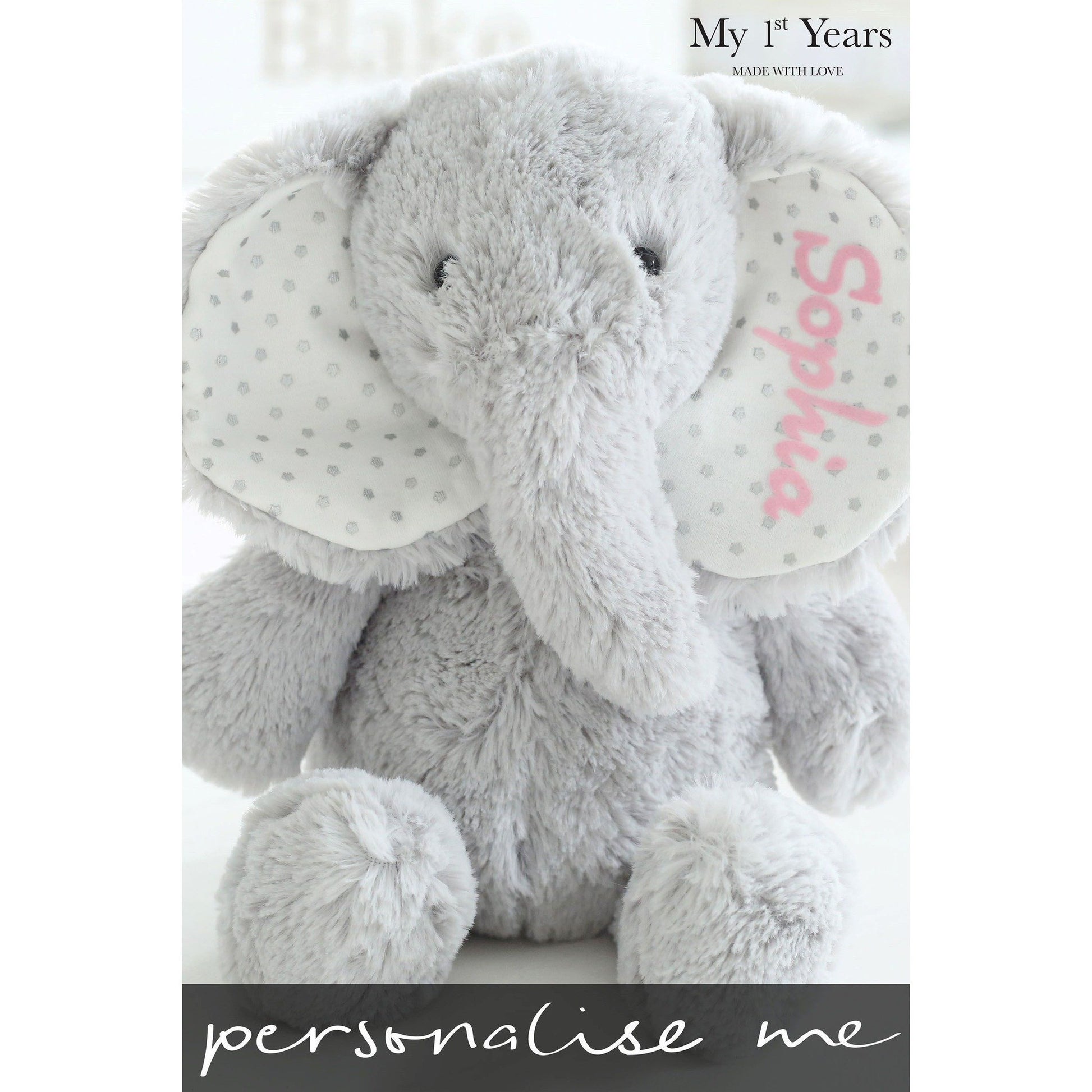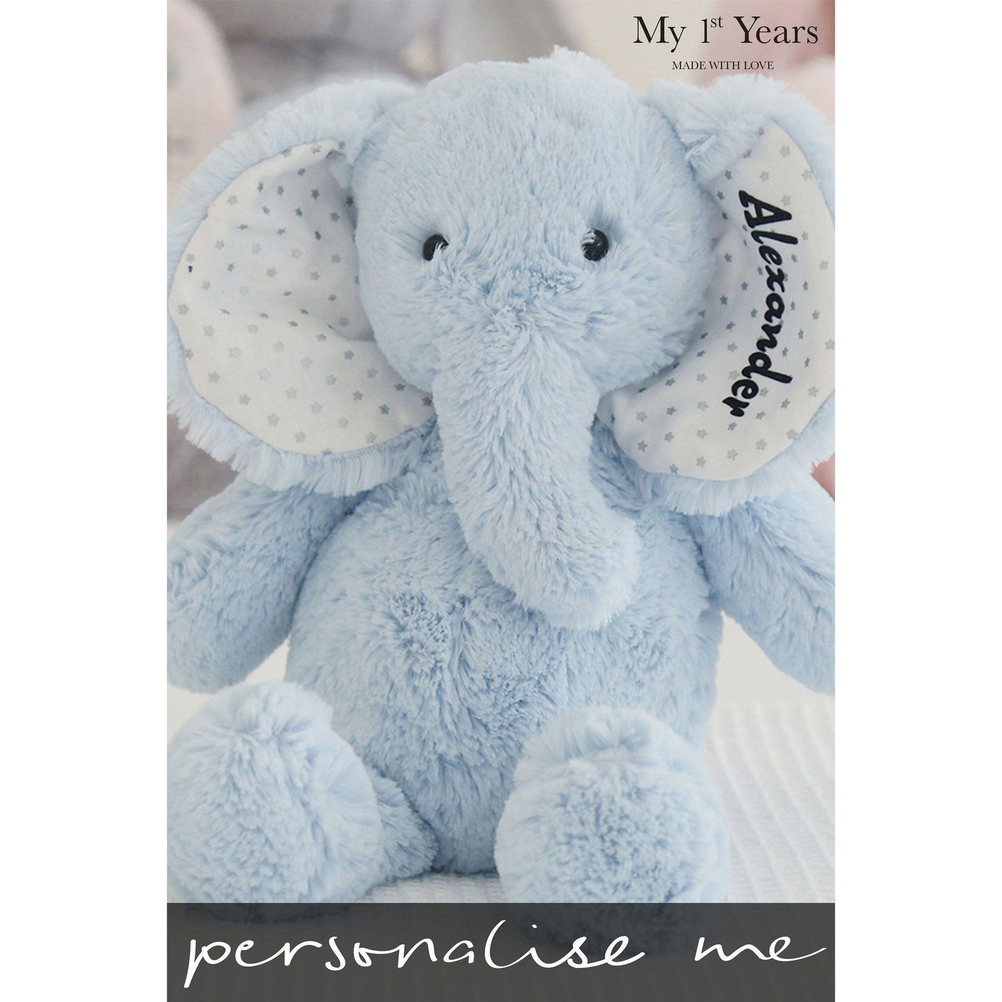 Elefante de brinquedo macio, em um tamanho perfeito para transportar em qualquer lugar, isso faz um presente maravilhoso. Personalize escolhendo o nome do seu filho para ser lançado na orelha do elefante para um presente especial. Vem saco de presente.