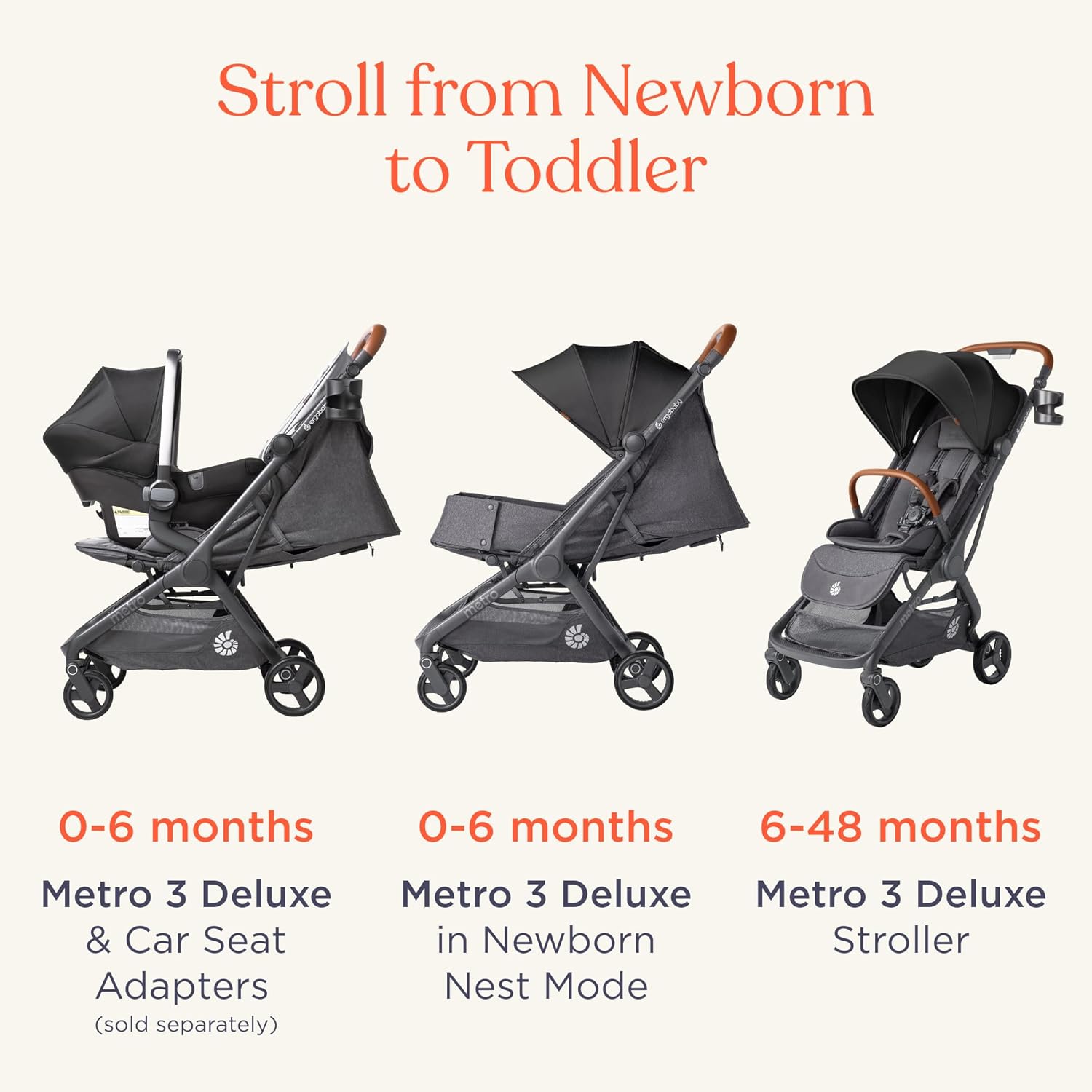 Ergobaby Carrinho de Bebê Metro 3 Deluxe com Função de Reclinação, Ideal para Bebês de 0 a 4 Anos (do Nascimento até 22kg), Dobrável com uma Só Mão e Compatível com Bebê Conforto, Cinza Pérola