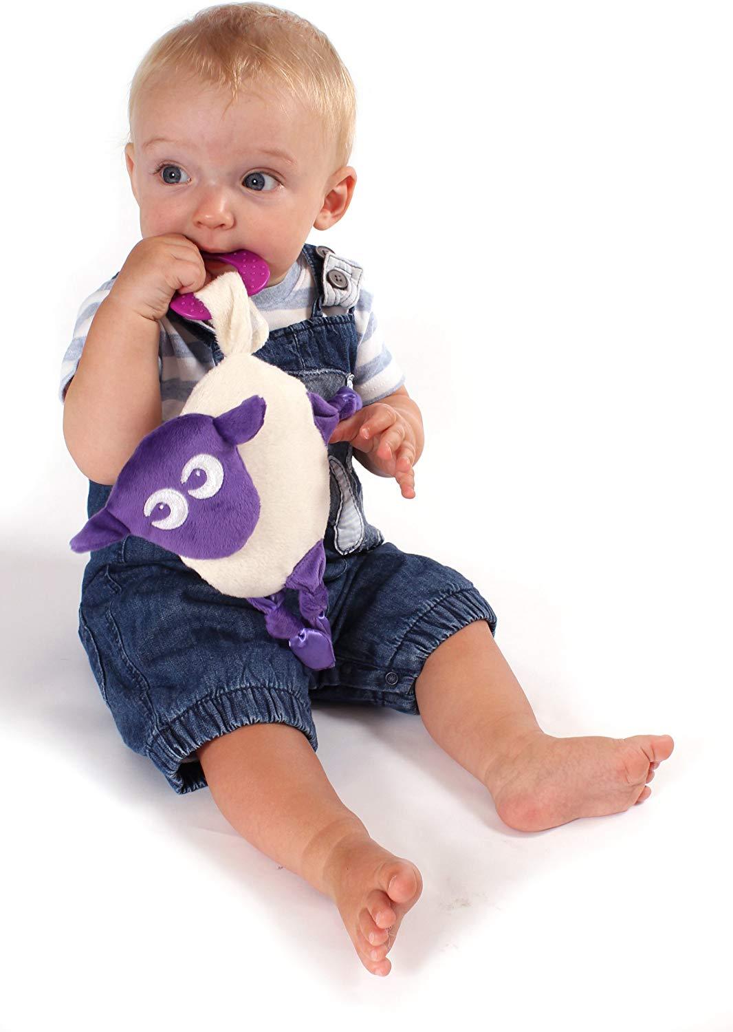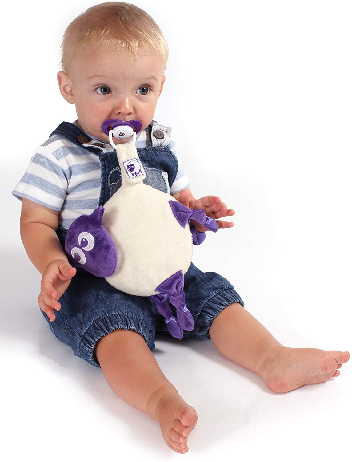 A cauda de gancho e laço prende a chupeta ou o mordedor e o mantém por perto. A cauda pode ser tambem facilmente conectada ao carrinho ou ao assento do carro quando estiver fora.