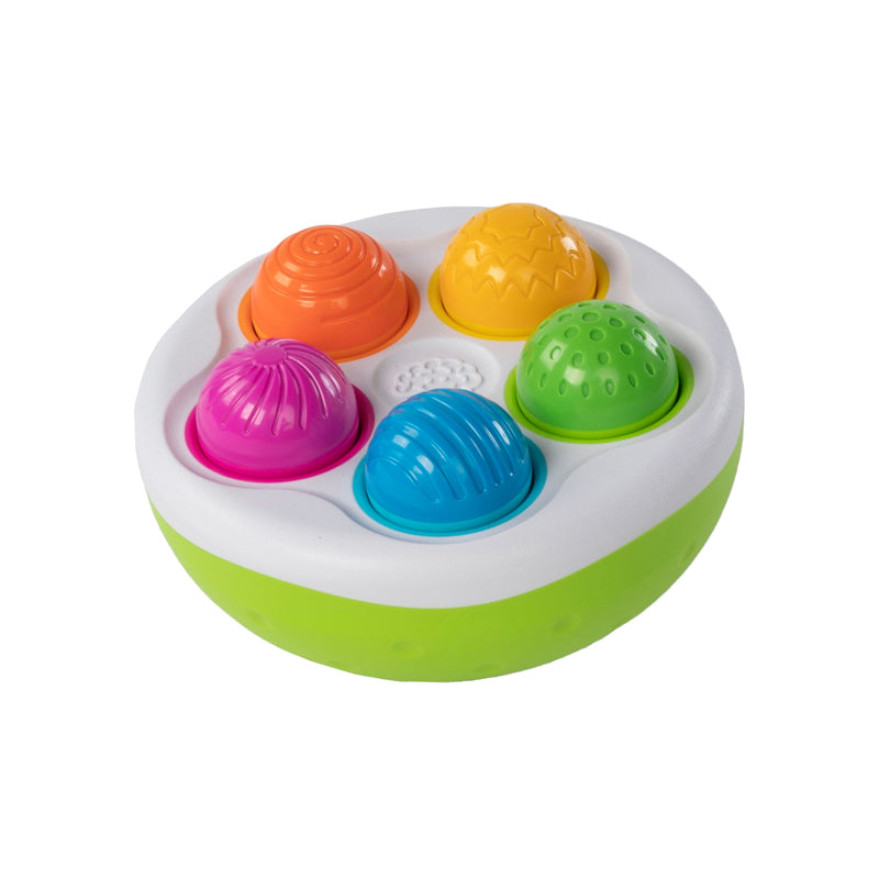 Cada um dos cinco pinos coloridos apresenta texturas fascinantes para sentir, além de uma base ponderada que oscila maravilhosamente.
