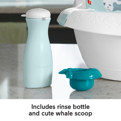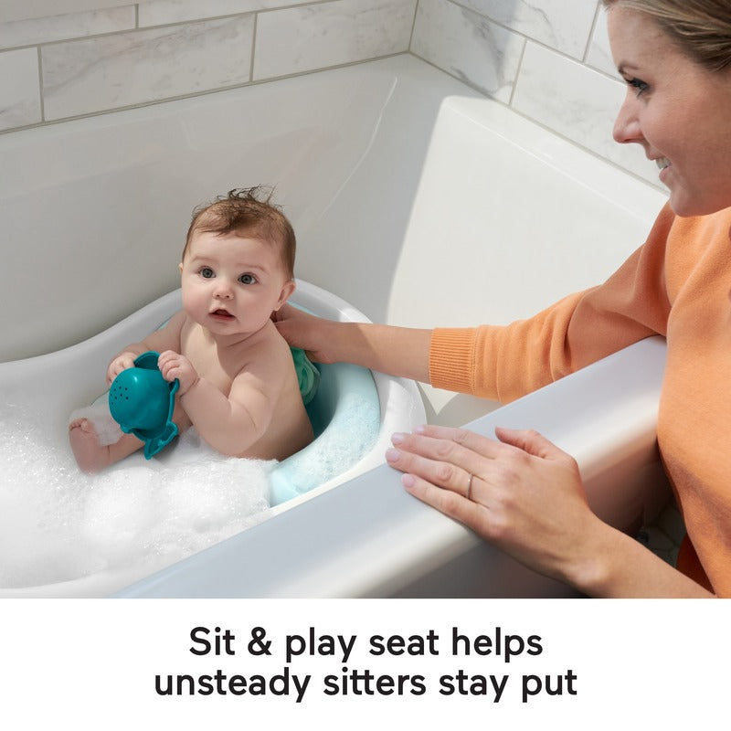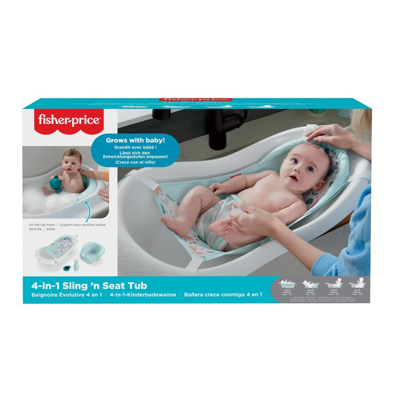 A banheira Fisher-Price® 4 em 1 Sling 'n Seat pode fazer tudo, desde a funda de malha de suporte construída para o primeiro banho do bebê, até a baleia e o gêiser (ou são uma colher e uma garrafa de enxágue?).