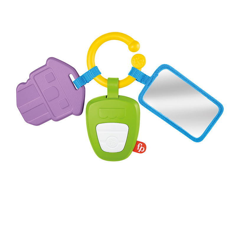Este conjunto de chaves falsas inclui um mordedor de chave em borracha, um chocalho de chaveiro de carro e um espelho de cartão de identificação.