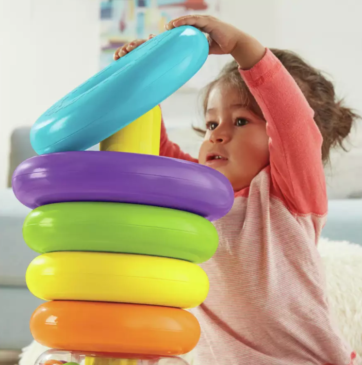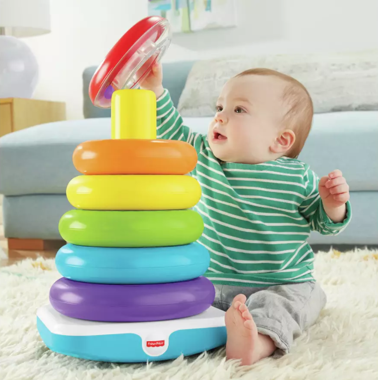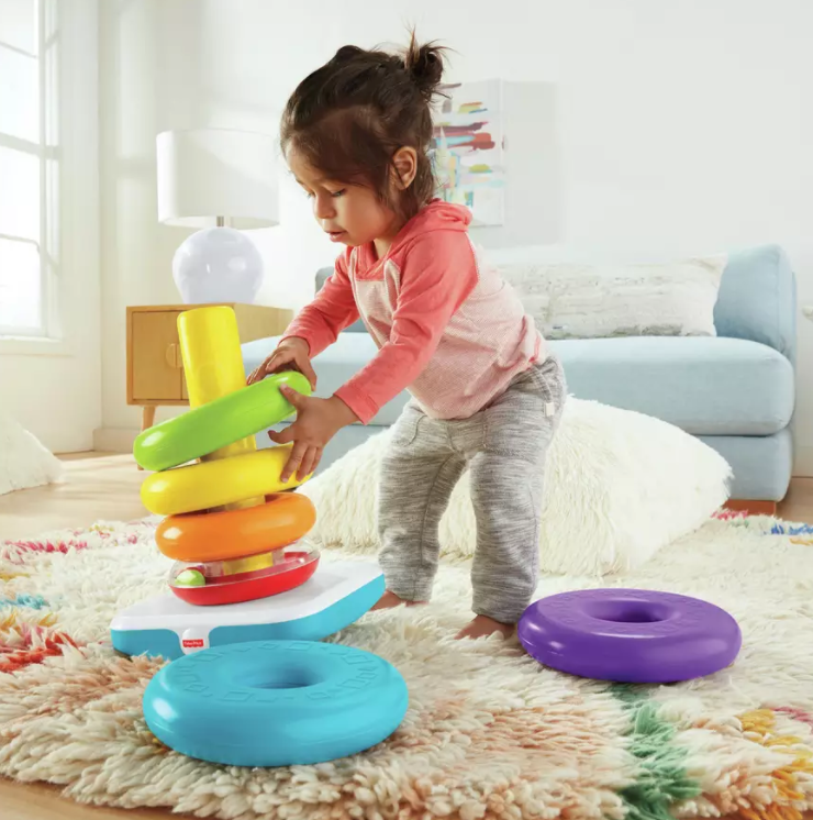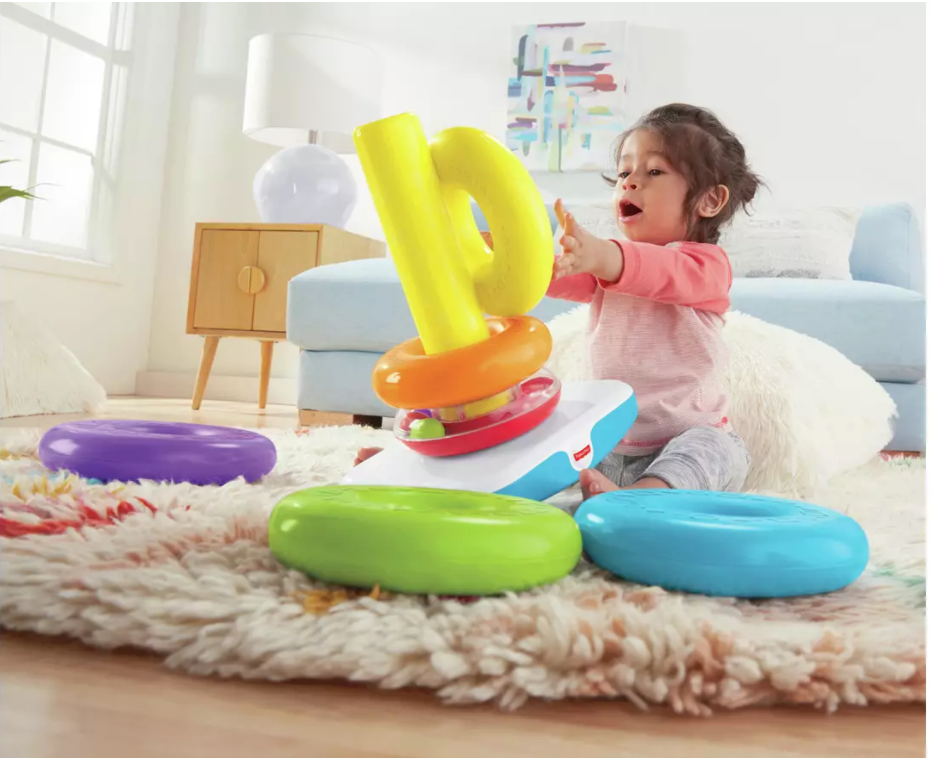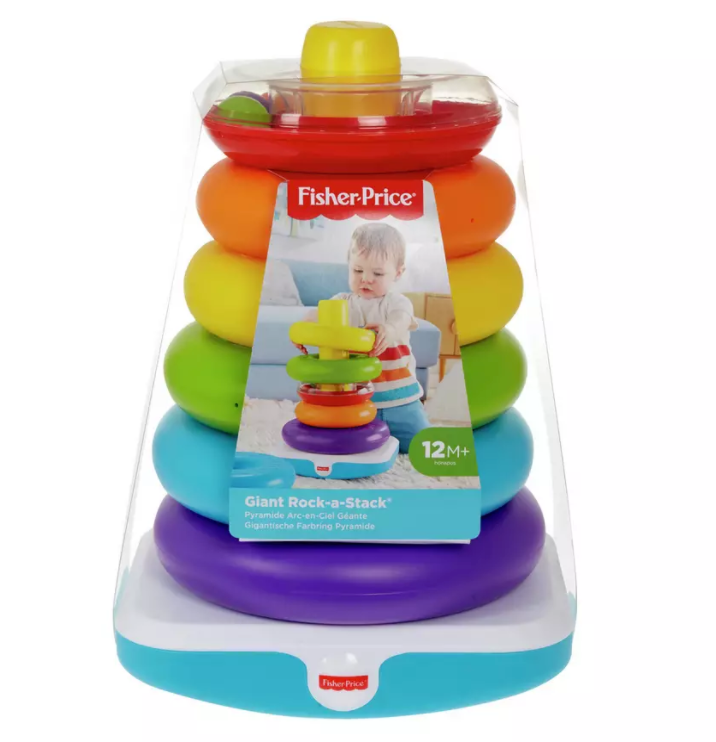 O clássico brinquedo de empilhamento Fisher-Price fica superdimensionado - com mais de 40cm de altura