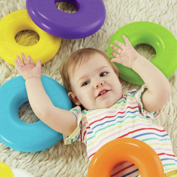 6 anéis coloridos para o seu bebê agarrar, agitar, empilhar e explorar