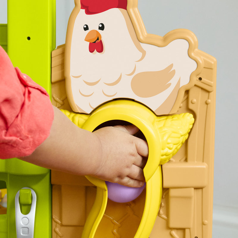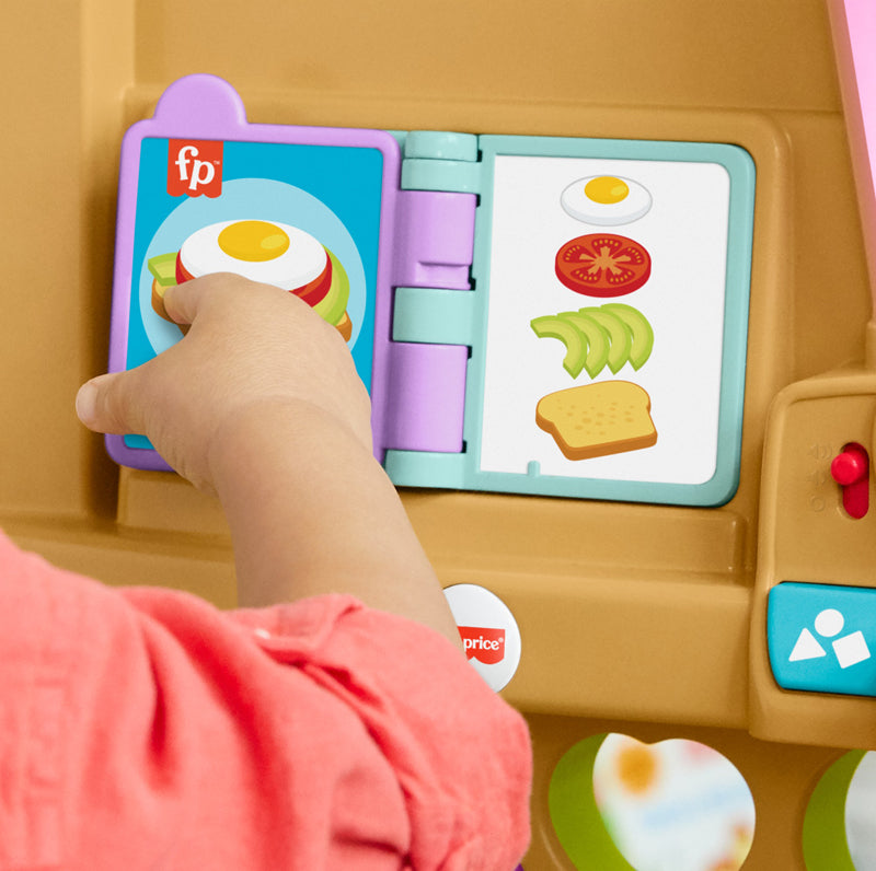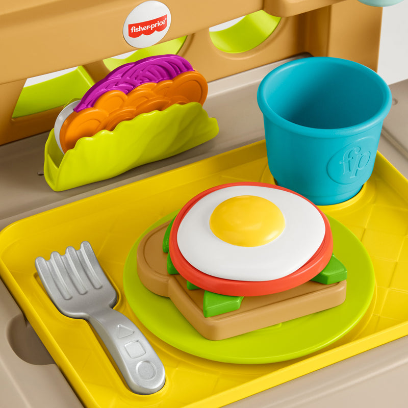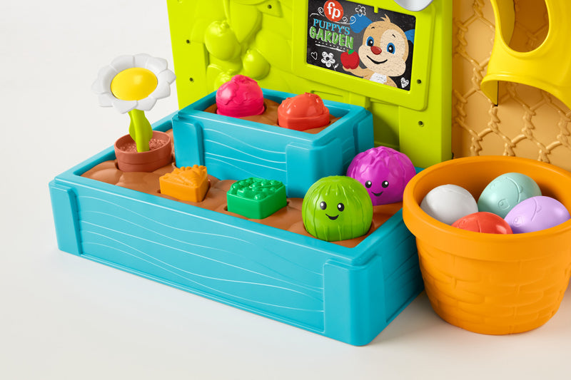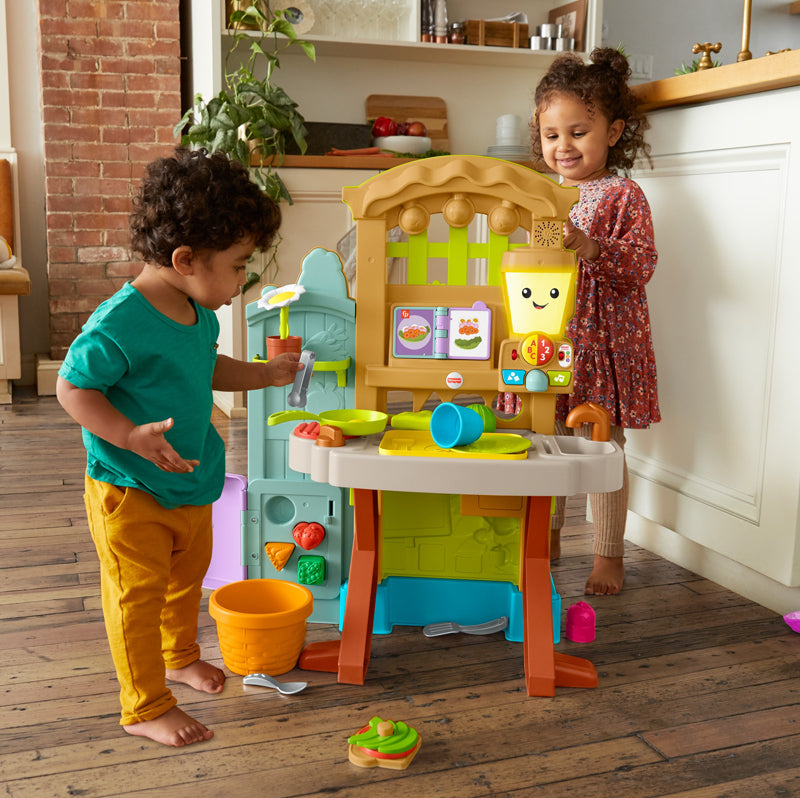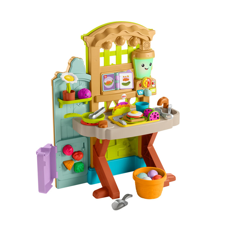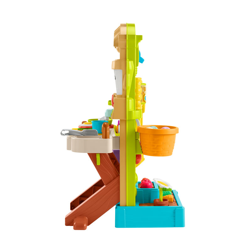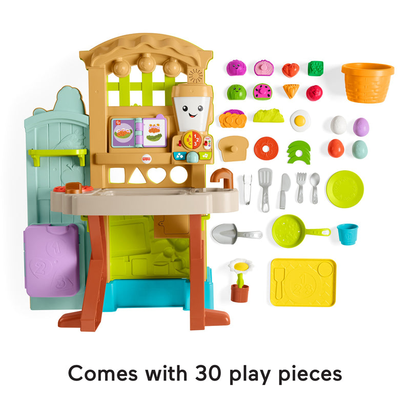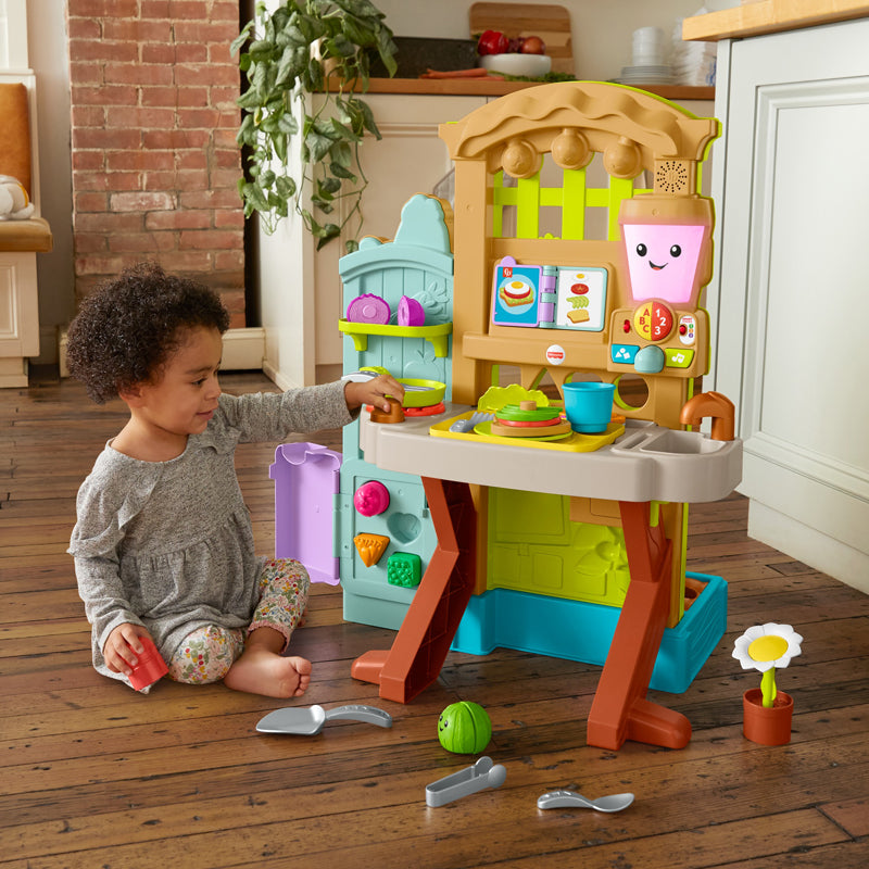 Com o playset Fisher-Price Laugh & Learn Grow-the-Fun Garden to Kitchen, as crianças podem “plantar”, escolher, “preparar” e servir comida de mentira fresca, criando suas próprias refeições deliciosas da fazenda para a mesa.