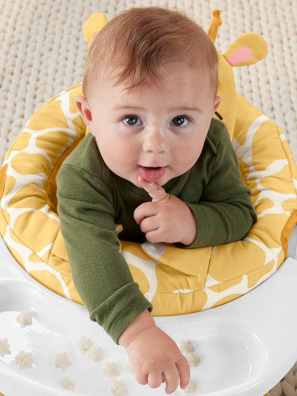 O assento macio ajuda a apoiar os assistentes instáveis para que eles possam se sentar, brincar e até mesmo pegar um lanche na bandeja removível. A adorável almofada de assento pode ser lavada na máquina e possui um encosto de cabeça de girafa macio e lindos “cascos” que enrugam, além de uma almofada de squeaker para seu bebê descobrir.
