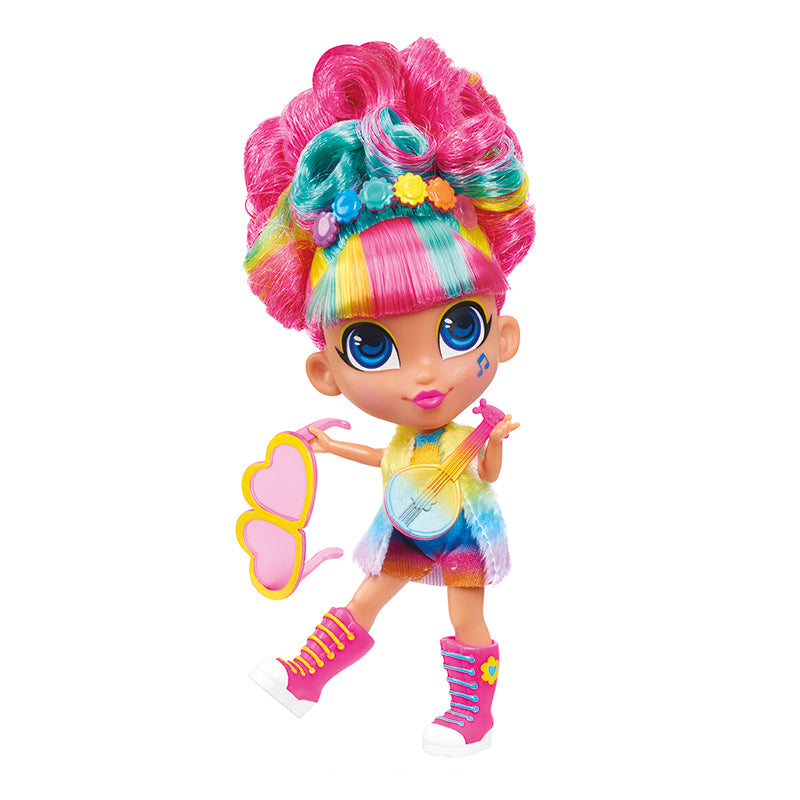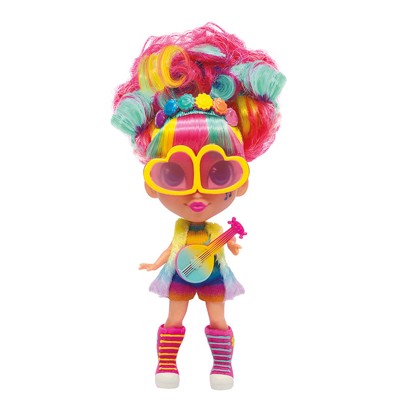 Use os acessórios de Rayne com os adoráveis óculos cor-de-rosa e a coroa de flores do arco-íris, inspirada na coroa que Poppy usa no filme DreamWorks Trolls World Tour! Rayne até vem com um ukulele, assim como Poppy.