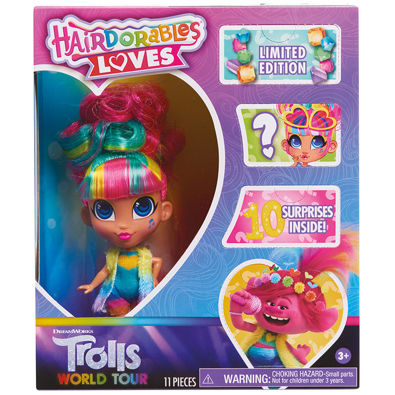 Esta edição limitada Hairdorables Loves DreamWorks Trolls World Tour Collectible Doll inclui 10 surpresas temáticas Trolls! Rayne vem vestida com uma roupa de arco-íris e mal pode esperar para mostrar seus acessórios coloridos.