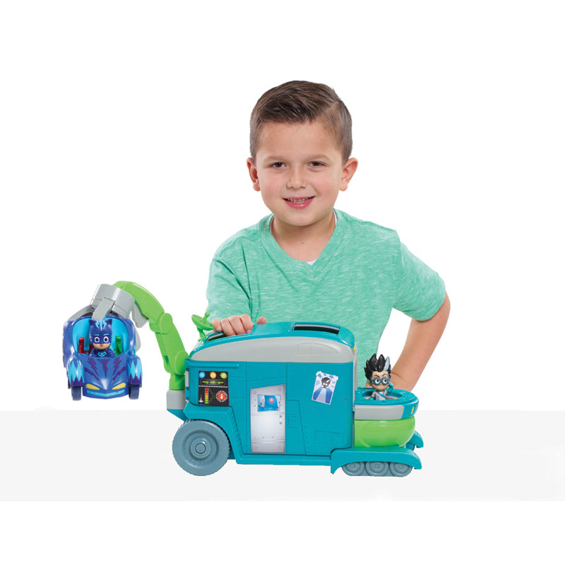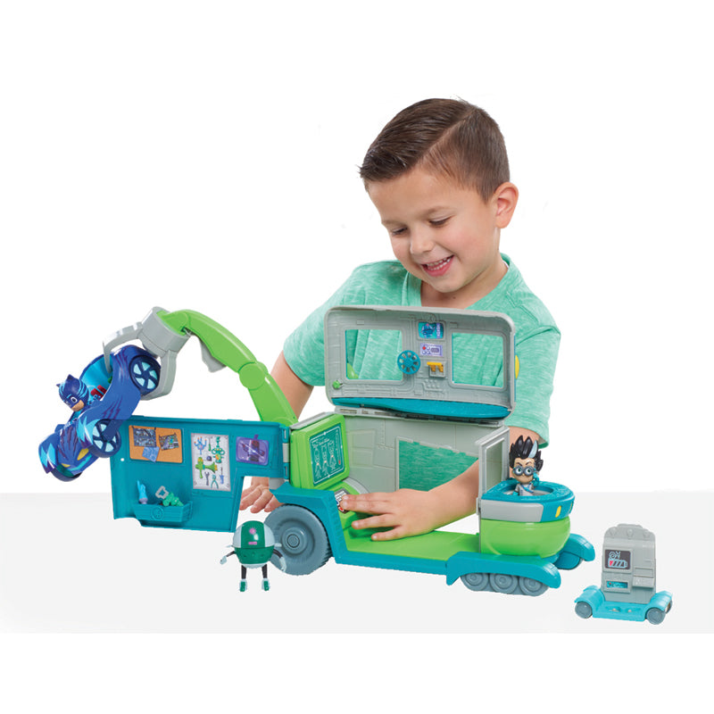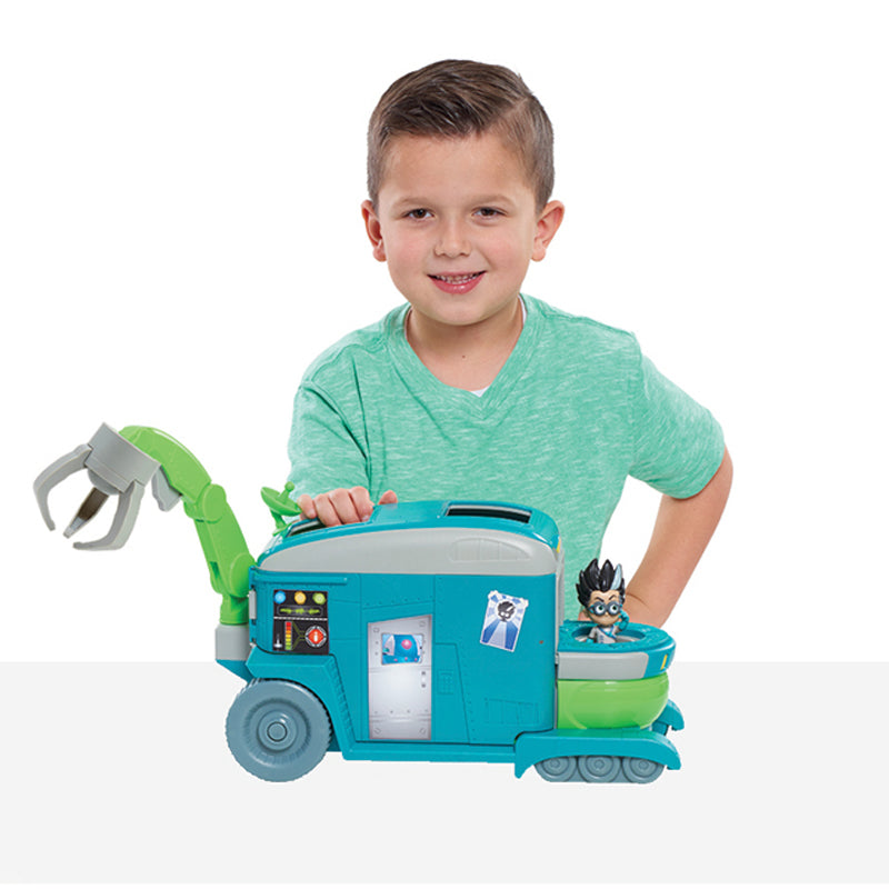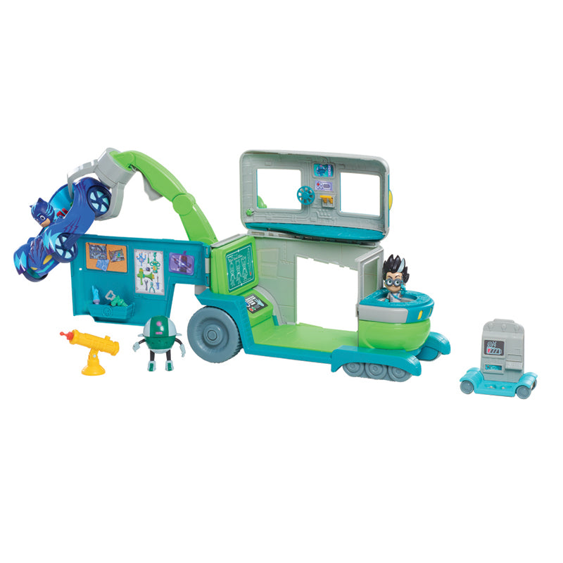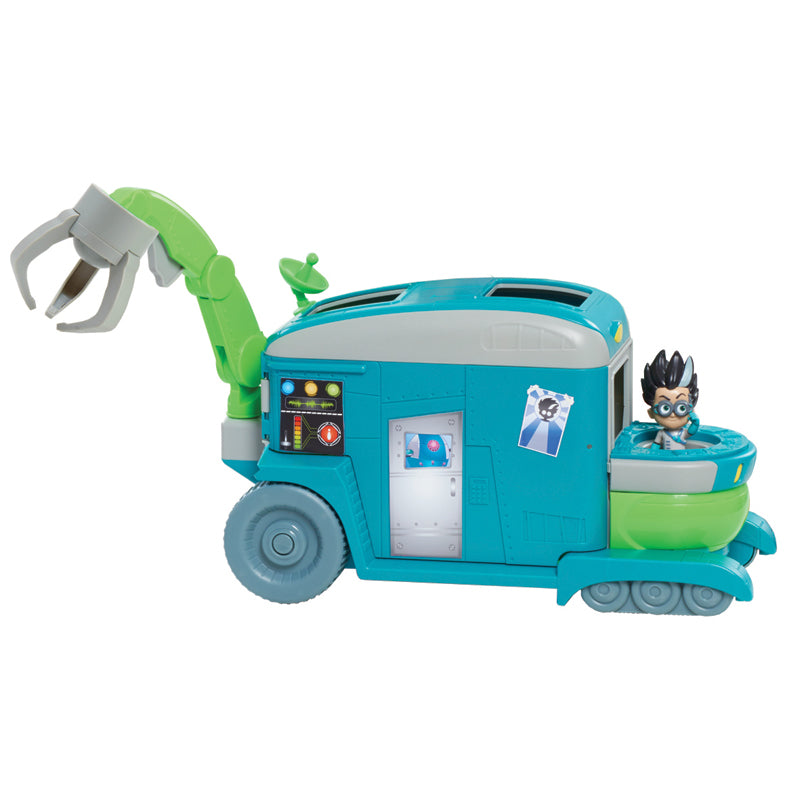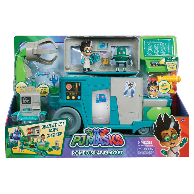O laboratório de Romeu pode realmente rolar e se abrir para revelar um covil secreto com dois níveis de jogo! O playset possui um painel de controle de luz e som, guindaste operacional, lançador de laser e carregador de laboratório rotativo! Romeo pode usar o painel de controle para traçar seus esquemas de cientista maluco e então atirar em seu lançador de laser quando as Máscaras PJ vierem pará-lo!