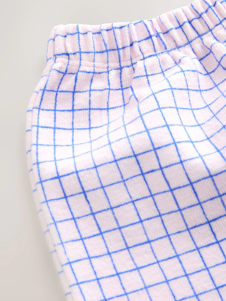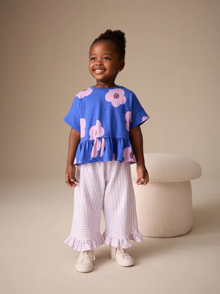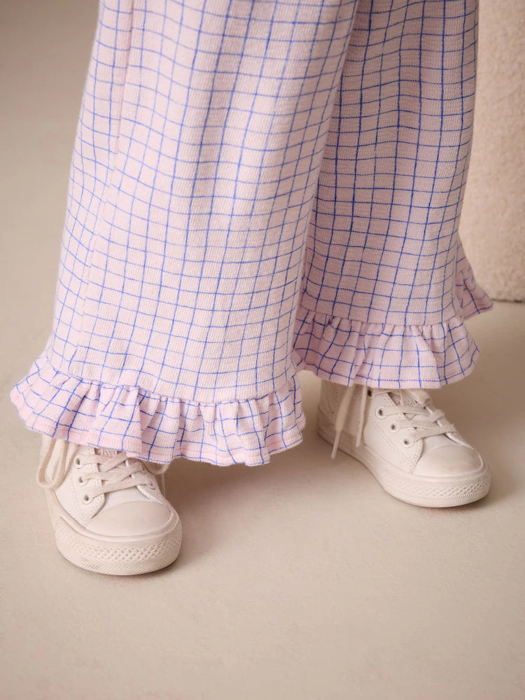 |Girl| Calças De Perna Larga Com Babados e Estampa Xadrez Rosa/Azul (3 meses a 7 anos)