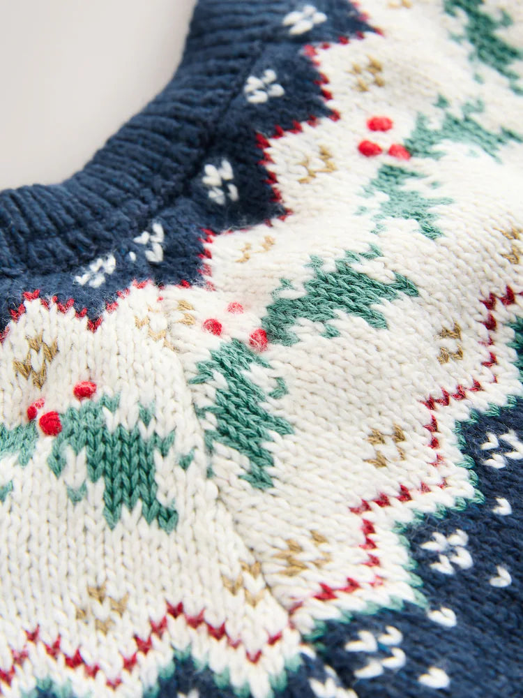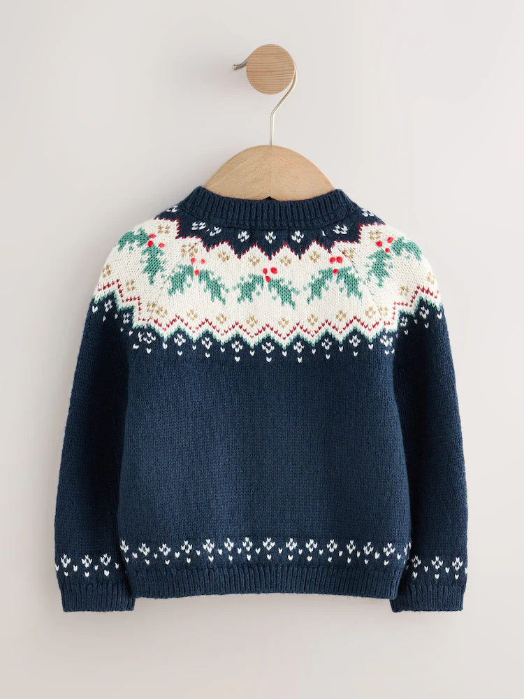 |Girl| Cardigan Azul Marinho Com Estampa De Azevinho e Natal (3 meses a 7 anos)
