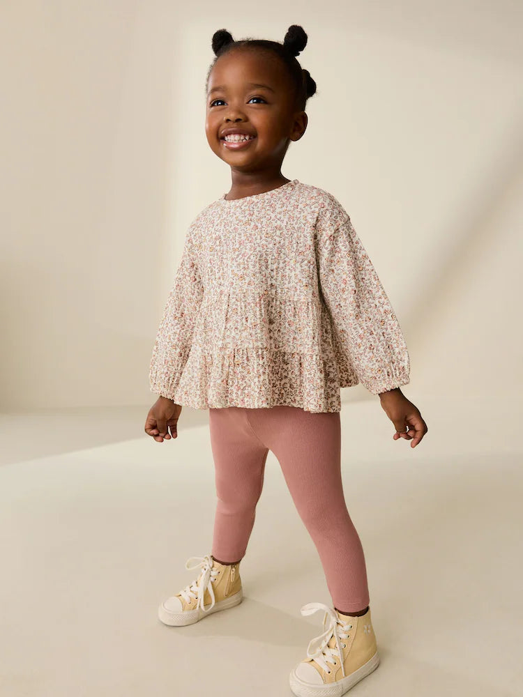 |Girl| Conjunto De Blusa De Manga Comprida e Leggings Com Estampa Floral Miúda Em Tons Neutros (3 meses a 7 anos)