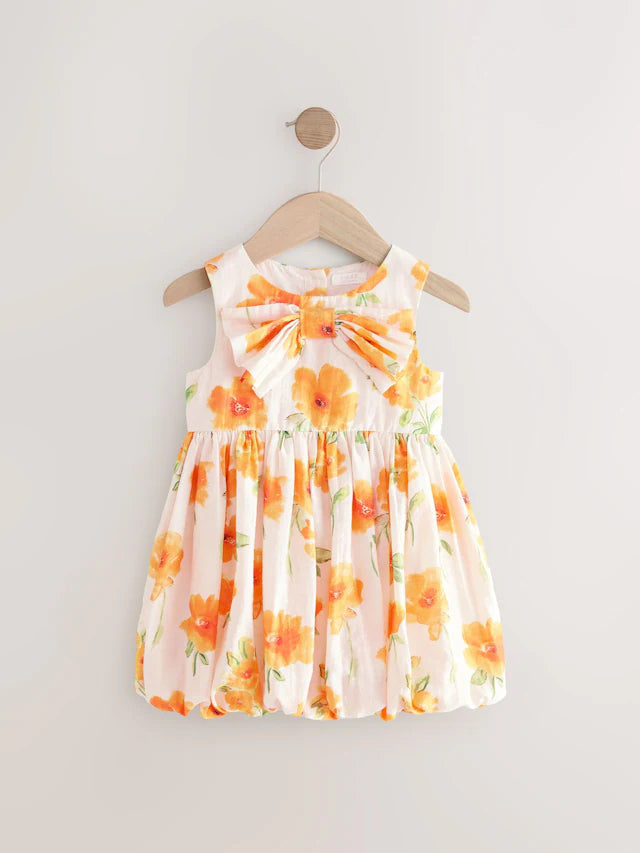 |Girl| Vestido Com Laço e Bainha De Bolhas Floral Laranja (3 meses a 8 anos)
